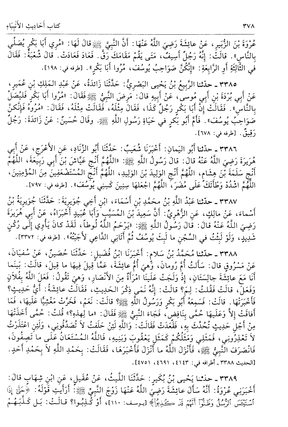 عُرْوَةَ بْنَ الزُّبَيْرِ عَنْ عَائِشَةَ - رضى الله عنها - أَنَّ النَّبِىَّ - صلى الله عليه وسلم - قَالَ لَهَا «مُرِى أَبَا بَكْرٍ يُصَلِّى بِالنَّاسِ». قَالَتْ إِنَّهُ رَجُلٌ أَسِيفٌ، مَتَى يَقُمْ مَقَامَكَ رَقَّ. فَعَادَ فَعَادَتْ، قَالَ شُعْبَةُ فَقَالَ فِى الثَّالِثَةِ أَوِ الرَّابِعَةِ «إِنَّكُنَّ صَوَاحِبُ يُوسُفَ، مُرُوا أَبَا بَكْرٍ». أطرافه 198، 664، 665، 679، 683، 687، 712، 713، 716، 2588، 3099، 4442، 4445، 5714، 7303 تحفة 16341