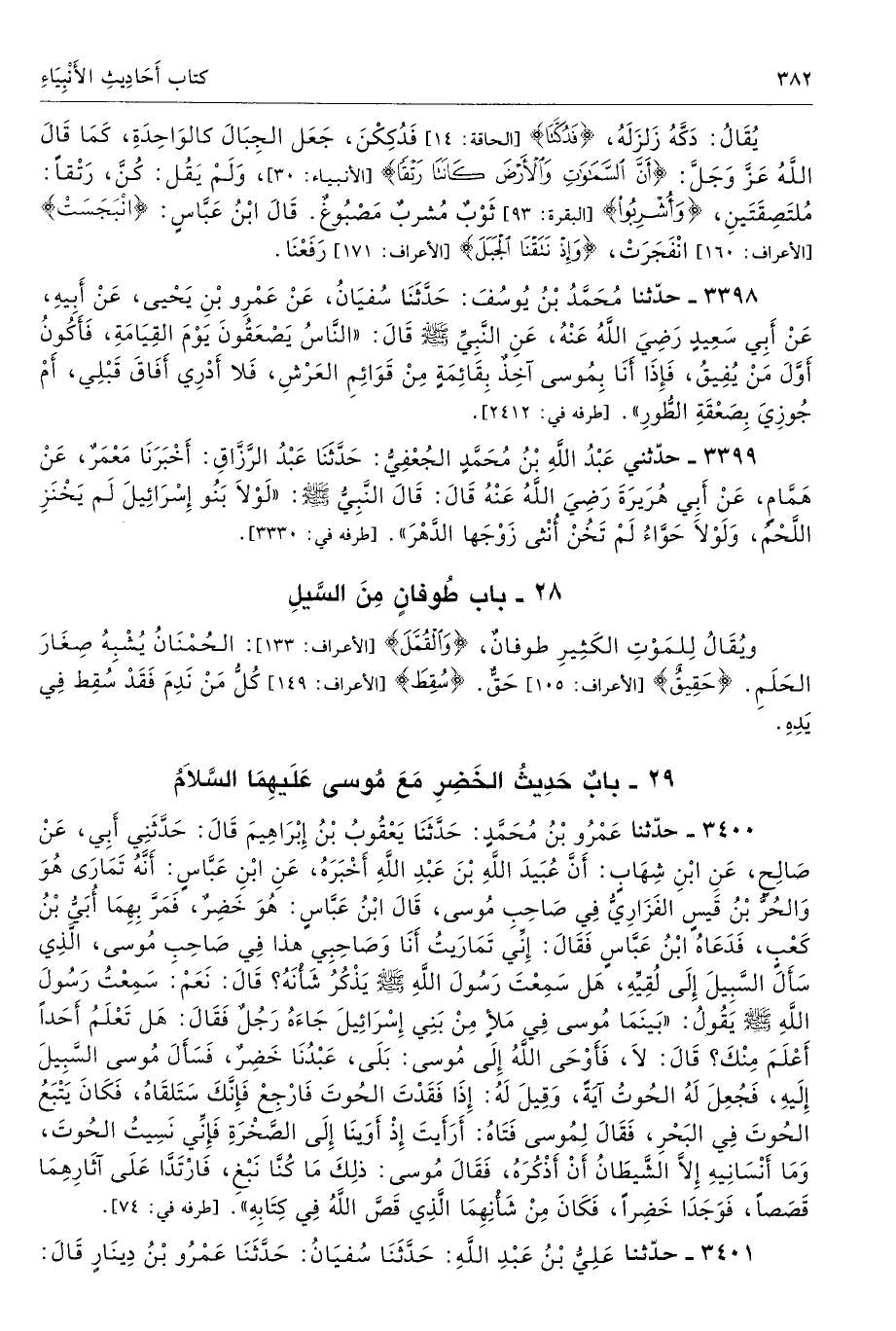 3400 - حَدَّثَنَا عَمْرُو بْنُ مُحَمَّدٍ حَدَّثَنَا يَعْقُوبُ بْنُ إِبْرَاهِيمَ قَالَ حَدَّثَنِى أَبِى عَنْ صَالِحٍ عَنِ ابْنِ شِهَابٍ أَنَّ عُبَيْدَ اللَّهِ بْنَ عَبْدِ اللَّهِ أَخْبَرَهُ عَنِ ابْنِ عَبَّاسٍ أَنَّهُ تَمَارَى هُوَ وَالْحُرُّ بْنُ قَيْسٍ الْفَزَارِىُّ فِى صَاحِبِ مُوسَى، قَالَ ابْنُ عَبَّاسٍ هُوَ خَضِرٌ، فَمَرَّ بِهِمَا أُبَىُّ بْنُ كَعْبٍ، فَدَعَاهُ ابْنُ عَبَّاسٍ، فَقَالَ إِنِّى تَمَارَيْتُ أَنَا وَصَاحِبِى هَذَا فِى صَاحِبِ مُوسَى الَّذِى سَأَلَ السَّبِيلَ إِلَى لُقِيِّهِ، هَلْ سَمِعْتَ رَسُولَ اللَّهِ - صلى الله عليه وسلم - يَذْكُرُ شَأْنَهُ قَالَ نَعَمْ سَمِعْتُ رَسُولَ اللَّهِ - صلى الله عليه وسلم - يَقُولُ «بَيْنَمَا مُوسَى فِى مَلإٍ مِنْ بَنِى إِسْرَائِيلَ جَاءَهُ رَجُلٌ، فَقَالَ هَلْ تَعْلَمُ أَحَدًا أَعْلَمَ مِنْكَ قَالَ لاَ. فَأَوْحَى اللَّهُ إِلَى مُوسَى بَلَى عَبْدُنَا خَضِرٌ. فَسَأَلَ مُوسَى السَّبِيلَ إِلَيْهِ، فَجُعِلَ لَهُ الْحُوتُ آيَةً، وَقِيلَ لَهُ إِذَا فَقَدْتَ الْحُوتَ فَارْجِعْ، فَإِنَّكَ سَتَلْقَاهُ. فَكَانَ يَتْبَعُ الْحُوتَ فِى الْبَحْرِ، فَقَالَ لِمُوسَى فَتَاهُ أَرَأَيْتَ إِذْ أَوَيْنَا إِلَى الصَّخْرَةِ، فَإِنِّى نَسِيتُ الْحُوتَ، وَمَا أَنْسَانِيهِ إِلاَّ الشَّيْطَانُ أَنْ أَذْكُرَهُ. فَقَالَ مُوسَى ذَلِكَ مَا كُنَّا نَبْغِ. فَارْتَدَّا عَلَى آثَارِهِمَا قَصَصًا فَوَجَدَا خَضِرًا، فَكَانَ مِنْ شَأْنِهِمَا الَّذِى قَصَّ اللَّهُ فِى كِتَابِهِ». أطرافه 74، 78، 122، 2267، 2728، 3278، 3401، 4725، 4726، 4727، 6672، 7478 - تحفة 39 - 188/ 4