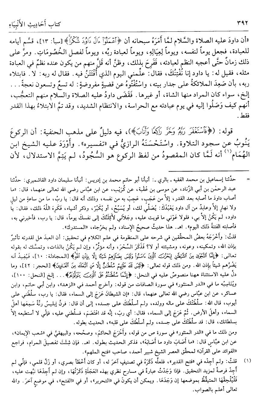 = حدَّثنا إسماعيل بن محمد الفقيه -بالري-: أنبأنا أبو حاتم محمد بن إدريس: أنبأنا سليمان داود القاشميري: حدَّثنا عبد الرحمن بن أبي الزِّناد، عن موسى بن عُقْبة، عن كُرَيب، عن ابن عبَّاس رضي الله تعالى عنهما، قال: "ما أصاب داودَ ما أصابه بعد القدر، إلَّا من عَجَبٍ، عَجِبَ به من نفسه، وذلك أنه قال: يا ربِّ، ما من ساعةٍ من ليلٍ ولا نهارٍ إلَّا وعابدٌ من آل داود يَعْبُدُكَ: يُصَلِّي لك، أو يُسَبِّحُ، أو يُكَبِّرُ، وذكر أشياء، فَكَرِهَ اللهُ ذلك، فقال: يا داود، لم يَكُن إلَّا بي، فلولا عَوْني ما قويت عليه، وجَلاَلي لأَكِلَنَّكَ إلى نفسكَ يومًا، قال: يا رب، فأخبرني به، فأصابته الفتنة ذلك اليوم". اهـ. هذا حديثٌ صحيحُ الإِسناد، ولم يخرِّجاه، "المستدرك".