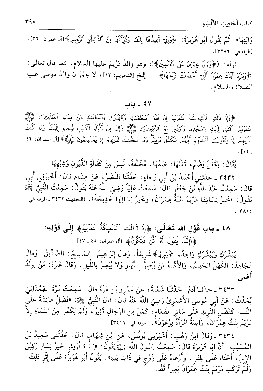 48 - باب قَوْلِ اللهِ تَعَالَى: {إِذْ قَالَتِ الْمَلَائِكَةُ يَا مَرْيَمُ} إِلَى قَوْلِهِ: {فَإِنَّمَا يَقُولُ لَهُ كُنْ فَيَكُونُ} [آل عمران: 45 - 47]
