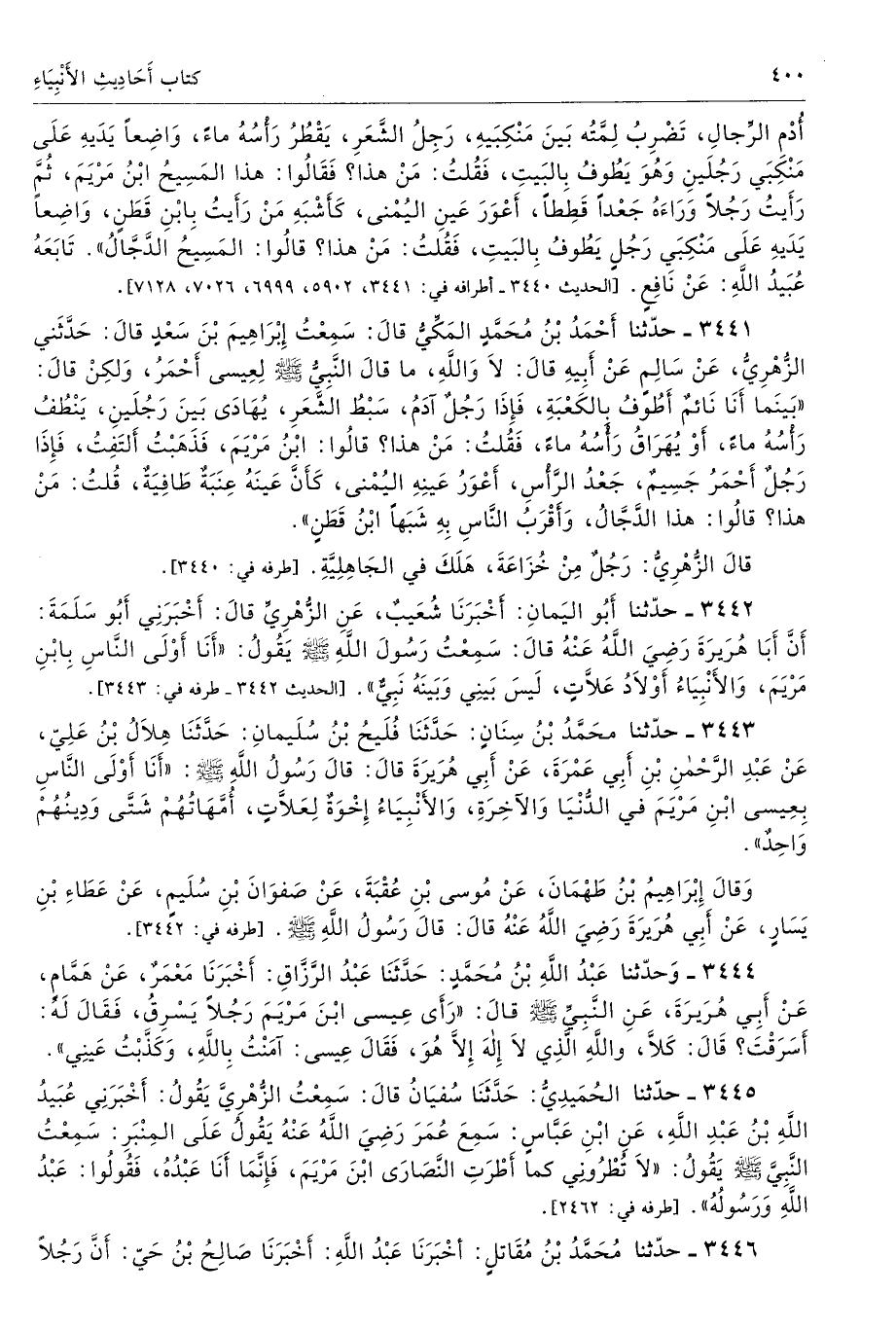 3441 - حَدَّثَنَا أَحْمَدُ بْنُ مُحَمَّدٍ الْمَكِّىُّ قَالَ سَمِعْتُ إِبْرَاهِيمَ بْنَ سَعْدٍ قَالَ حَدَّثَنِى الزُّهْرِىُّ عَنْ سَالِمٍ عَنْ أَبِيهِ، قَالَ لاَ وَاللَّهِ مَا قَالَ النَّبِىُّ - صلى الله عليه وسلم - لِعِيسَى أَحْمَرُ، وَلَكِنْ قَالَ «بَيْنَمَا أَنَا نَائِمٌ أَطُوفُ بِالْكَعْبَةِ، فَإِذَا رَجُلٌ آدَمُ سَبْطُ الشَّعَرِ، يُهَادَى بَيْنَ رَجُلَيْنِ، يَنْطِفُ رَأْسُهُ مَاءً أَوْ يُهَرَاقُ رَأْسُهُ مَاءً فَقُلْتُ مَنْ هَذَا قَالُوا ابْنُ مَرْيَمَ، فَذَهَبْتُ أَلْتَفِتُ، فَإِذَا رَجُلٌ أَحْمَرُ جَسِيمٌ، جَعْدُ الرَّأْسِ، أَعْوَرُ عَيْنِهِ الْيُمْنَى، كَأَنَّ عَيْنَهُ عِنَبَةٌ طَافِيَةٌ. قُلْتُ مَنْ هَذَا قَالُوا هَذَا الدَّجَّالُ. وَأَقْرَبُ النَّاسِ بِهِ شَبَهًا ابْنُ قَطَنٍ».