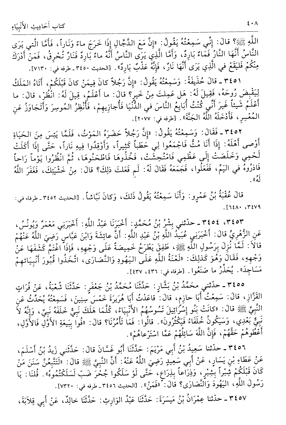 3456 - حَدَّثَنَا سَعِيدُ بْنُ أَبِى مَرْيَمَ حَدَّثَنَا أَبُو غَسَّانَ قَالَ حَدَّثَنِى زَيْدُ بْنُ أَسْلَمَ عَنْ عَطَاءِ بْنِ يَسَارٍ عَنْ أَبِى سَعِيدٍ - رضى الله عنه - أَنَّ النَّبِىَّ - صلى الله عليه وسلم - قَالَ «لَتَتَّبِعُنَّ سَنَنَ مَنْ قَبْلَكُمْ شِبْرًا بِشِبْرٍ، وَذِرَاعًا بِذِرَاعٍ، حَتَّى لَوْ سَلَكُوا جُحْرَ ضَبٍّ لَسَلَكْتُمُوهُ». قُلْنَا يَا رَسُولَ اللَّهِ، الْيَهُودَ وَالنَّصَارَى قَالَ «فَمَنْ». طرفه 7320 - تحفة 4171