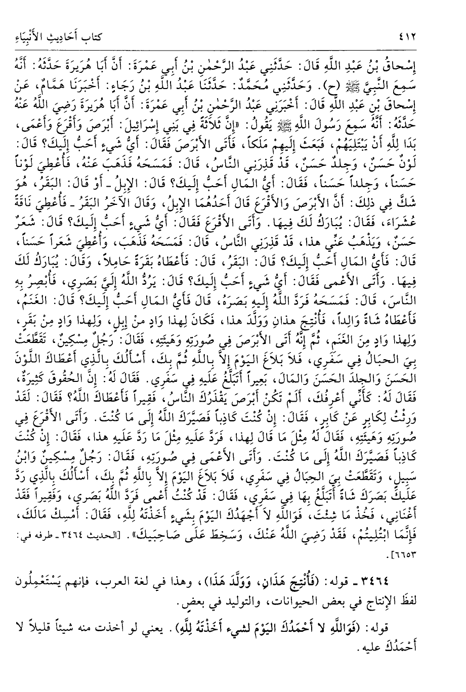 إِسْحَاقُ بْنُ عَبْدِ اللَّهِ قَالَ حَدَّثَنِى عَبْدُ الرَّحْمَنِ بْنُ أَبِى عَمْرَةَ أَنَّ أَبَا هُرَيْرَةَ حَدَّثَهُ أَنَّهُ سَمِعَ النَّبِىَّ - صلى الله عليه وسلم - ح وَحَدَّثَنِى مُحَمَّدٌ حَدَّثَنَا عَبْدُ اللَّهِ بْنُ رَجَاءٍ أَخْبَرَنَا هَمَّامٌ عَنْ إِسْحَاقَ بْنِ عَبْدِ اللَّهِ قَالَ أَخْبَرَنِى عَبْدُ الرَّحْمَنِ بْنُ أَبِى عَمْرَةَ أَنَّ أَبَا هُرَيْرَةَ - رضى الله عنه - حَدَّثَهُ أَنَّهُ سَمِعَ رَسُولَ اللَّهِ - صلى الله عليه وسلم - يَقُولُ «إِنَّ ثَلاَثَةً فِى بَنِى إِسْرَائِيلَ أَبْرَصَ وَأَقْرَعَ وَأَعْمَى بَدَا لِلَّهِ أَنْ يَبْتَلِيَهُمْ، فَبَعَثَ إِلَيْهِمْ مَلَكًا، فَأَتَى الأَبْرَصَ. فَقَالَ أَىُّ شَىْءٍ أَحَبُّ إِلَيْكَ قَالَ لَوْنٌ حَسَنٌ وَجِلْدٌ حَسَنٌ، قَدْ قَذِرَنِى النَّاسُ. قَالَ فَمَسَحَهُ، فَذَهَبَ عَنْهُ، فَأُعْطِىَ لَوْنًا حَسَنًا وَجِلْدًا حَسَنًا. فَقَالَ أَىُّ الْمَالِ أَحَبُّ إِلَيْكَ قَالَ الإِبِلُ - أَوْ قَالَ الْبَقَرُ هُوَ شَكَّ فِى ذَلِكَ، إِنَّ الأَبْرَصَ وَالأَقْرَعَ، قَالَ أَحَدُهُمَا الإِبِلُ، وَقَالَ الآخَرُ الْبَقَرُ - فَأُعْطِىَ نَاقَةً عُشَرَاءَ. فَقَالَ يُبَارَكُ لَكَ فِيهَا. وَأَتَى الأَقْرَعَ فَقَالَ أَىُّ شَىْءٍ أَحَبُّ إِلَيْكَ قَالَ شَعَرٌ حَسَنٌ، وَيَذْهَبُ عَنِّى هَذَا، قَدْ قَذِرَنِى النَّاسُ. قَالَ فَمَسَحَهُ فَذَهَبَ، وَأُعْطِىَ شَعَرًا حَسَنًا. قَالَ فَأَىُّ الْمَالِ أَحَبُّ إِلَيْكَ قَالَ الْبَقَرُ. قَالَ فَأَعْطَاهُ بَقَرَةً حَامِلاً، وَقَالَ يُبَارَكُ لَكَ فِيهَا. وَأَتَى الأَعْمَى فَقَالَ أَىُّ شَىْءٍ أَحَبُّ إِلَيْكَ قَالَ يَرُدُّ اللَّهُ إِلَىَّ بَصَرِى، فَأُبْصِرُ بِهِ النَّاسَ. قَالَ فَمَسَحَهُ، فَرَدَّ اللَّهُ إِلَيْهِ بَصَرَهُ. قَالَ فَأَىُّ الْمَالِ أَحَبُّ إِلَيْكَ قَالَ الْغَنَمُ. فَأَعْطَاهُ شَاةً وَالِدًا، فَأُنْتِجَ هَذَانِ، وَوَلَّدَ هَذَا، فَكَانَ لِهَذَا وَادٍ مِنْ إِبِلٍ، وَلِهَذَا وَادٍ مِنْ بَقَرٍ، وَلِهَذَا وَادٍ مِنَ الْغَنَمِ. ثُمَّ إِنَّهُ أَتَى الأَبْرَصَ فِى صُورَتِهِ وَهَيْئَتِهِ فَقَالَ رَجُلٌ مِسْكِينٌ، تَقَطَّعَتْ بِىَ الْحِبَالُ فِى سَفَرِى، فَلاَ بَلاَغَ الْيَوْمَ إِلاَّ بِاللَّهِ ثُمَّ بِكَ، أَسْأَلُكَ بِالَّذِى أَعْطَاكَ اللَّوْنَ الْحَسَنَ وَالْجِلْدَ الْحَسَنَ وَالْمَالَ بَعِيرًا أَتَبَلَّغُ عَلَيْهِ فِى سَفَرِى. فَقَالَ لَهُ إِنَّ الْحُقُوقَ كَثِيرَةٌ. فَقَالَ لَهُ كَأَنِّى أَعْرِفُكَ، أَلَمْ تَكُنْ أَبْرَصَ يَقْذَرُكَ النَّاسُ فَقِيرًا فَأَعْطَاكَ اللَّهُ فَقَالَ لَقَدْ وَرِثْتُ لِكَابِرٍ عَنْ كَابِرٍ. فَقَالَ إِنْ كُنْتَ كَاذِبًا فَصَيَّرَكَ اللَّهُ إِلَى مَا كُنْتَ، وَأَتَى الأَقْرَعَ فِى صُورَتِهِ وَهَيْئَتِهِ، فَقَالَ لَهُ مِثْلَ مَا قَالَ لِهَذَا، فَرَدَّ عَلَيْهِ مِثْلَ مَا رَدَّ عَلَيْهِ هَذَا فَقَالَ إِنْ كُنْتَ كَاذِبًا فَصَيَّرَكَ اللَّهُ إِلَى مَا كُنْتَ. وَأَتَى الأَعْمَى فِى صُورَتِهِ فَقَالَ رَجُلٌ مِسْكِينٌ وَابْنُ سَبِيلٍ وَتَقَطَّعَتْ بِىَ الْحِبَالُ فِى سَفَرِى، فَلاَ بَلاَغَ الْيَوْمَ إِلاَّ بِاللَّهِ، ثُمَّ بِكَ أَسْأَلُكَ بِالَّذِى رَدَّ عَلَيْكَ بَصَرَكَ شَاةً أَتَبَلَّغُ بِهَا فِى سَفَرِى. فَقَالَ قَدْ كُنْتُ أَعْمَى فَرَدَّ اللَّهُ بَصَرِى، وَفَقِيرًا فَقَدْ أَغْنَانِى، فَخُذْ مَا شِئْتَ، فَوَاللَّهِ لاَ أَجْهَدُكَ الْيَوْمَ بِشَىْءٍ أَخَذْتَهُ لِلَّهِ. فَقَالَ أَمْسِكْ مَالَكَ، فَإِنَّمَا ابْتُلِيتُمْ، فَقَدْ رَضِىَ اللَّهُ عَنْكَ وَسَخِطَ عَلَى صَاحِبَيْكَ». طرفه 6653 - تحفة 13602 - 209/ 4