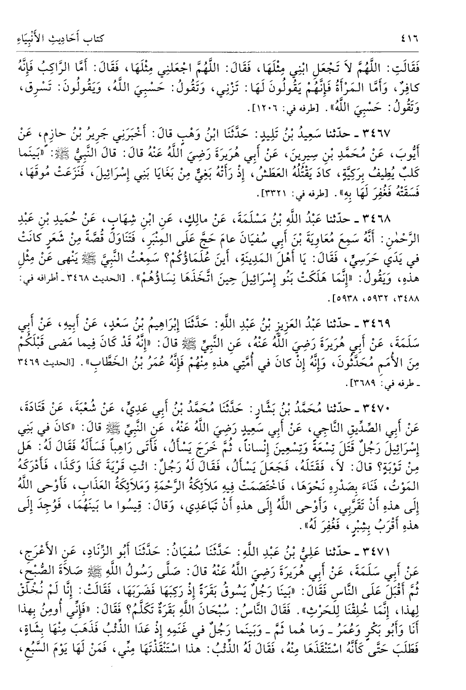3471 - حَدَّثَنَا عَلِىُّ بْنُ عَبْدِ اللَّهِ حَدَّثَنَا سُفْيَانُ حَدَّثَنَا أَبُو الزِّنَادِ عَنِ الأَعْرَجِ عَنْ أَبِى سَلَمَةَ عَنْ أَبِى هُرَيْرَةَ - رضى الله عنه - قَالَ صَلَّى رَسُولُ اللَّهِ - صلى الله عليه وسلم - صَلاَةَ الصُّبْحِ، ثُمَّ أَقْبَلَ عَلَى النَّاسِ، فَقَالَ «بَيْنَا رَجُلٌ يَسُوقُ بَقَرَةً إِذْ رَكِبَهَا فَضَرَبَهَا فَقَالَتْ إِنَّا لَمْ نُخْلَقْ لِهَذَا، إِنَّمَا خُلِقْنَا لِلْحَرْثِ». فَقَالَ النَّاسُ سُبْحَانَ اللَّهِ بَقَرَةٌ تَكَلَّمُ. فَقَالَ «فَإِنِّى أُومِنُ بِهَذَا أَنَا وَأَبُو بَكْرٍ وَعُمَرُ - وَمَا هُمَا ثَمَّ - وَبَيْنَمَا رَجُلٌ فِى غَنَمِهِ إِذْ عَدَا الذِّئْبُ فَذَهَبَ مِنْهَا بِشَاةٍ، فَطَلَبَ حَتَّى كَأَنَّهُ اسْتَنْقَذَهَا مِنْهُ، فَقَالَ لَهُ الذِّئْبُ هَذَا اسْتَنْقَذْتَهَا مِنِّى فَمَنْ لَهَا يَوْمَ السَّبُعِ،