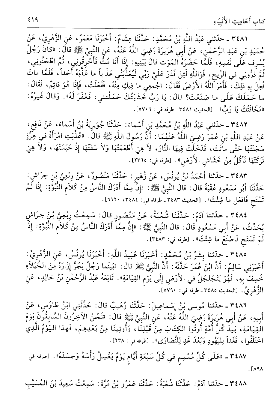 3481 - حَدَّثَنِى عَبْدُ اللَّهِ بْنُ مُحَمَّدٍ حَدَّثَنَا هِشَامٌ أَخْبَرَنَا مَعْمَرٌ عَنِ الزُّهْرِىِّ عَنْ حُمَيْدِ بْنِ عَبْدِ الرَّحْمَنِ عَنْ أَبِى هُرَيْرَةَ - رضى الله عنه - عَنِ النَّبِىِّ - صلى الله عليه وسلم - قَالَ «كَانَ رَجُلٌ يُسْرِفُ عَلَى نَفْسِهِ، فَلَمَّا حَضَرَهُ الْمَوْتُ قَالَ لِبَنِيهِ إِذَا أَنَا مُتُّ فَأَحْرِقُونِى ثُمَّ اطْحَنُونِى ثُمَّ ذَرُّونِى فِى الرِّيحِ، فَوَاللَّهِ لَئِنْ قَدَرَ عَلَىَّ رَبِّى لَيُعَذِّبَنِّى عَذَابًا مَا عَذَّبَهُ أَحَدًا. فَلَمَّا مَاتَ فُعِلَ بِهِ ذَلِكَ، فَأَمَرَ اللَّهُ الأَرْضَ، فَقَالَ اجْمَعِى مَا فِيكِ مِنْهُ. فَفَعَلَتْ فَإِذَا هُوَ قَائِمٌ، فَقَالَ مَا حَمَلَكَ عَلَى مَا صَنَعْتَ قَالَ يَا رَبِّ، خَشْيَتُكَ. فَغَفَرَ لَهُ». وَقَالَ غَيْرُهُ «مَخَافَتُكَ يَا رَبِّ». طرفه 7506 - تحفة 12280 - 215/ 4