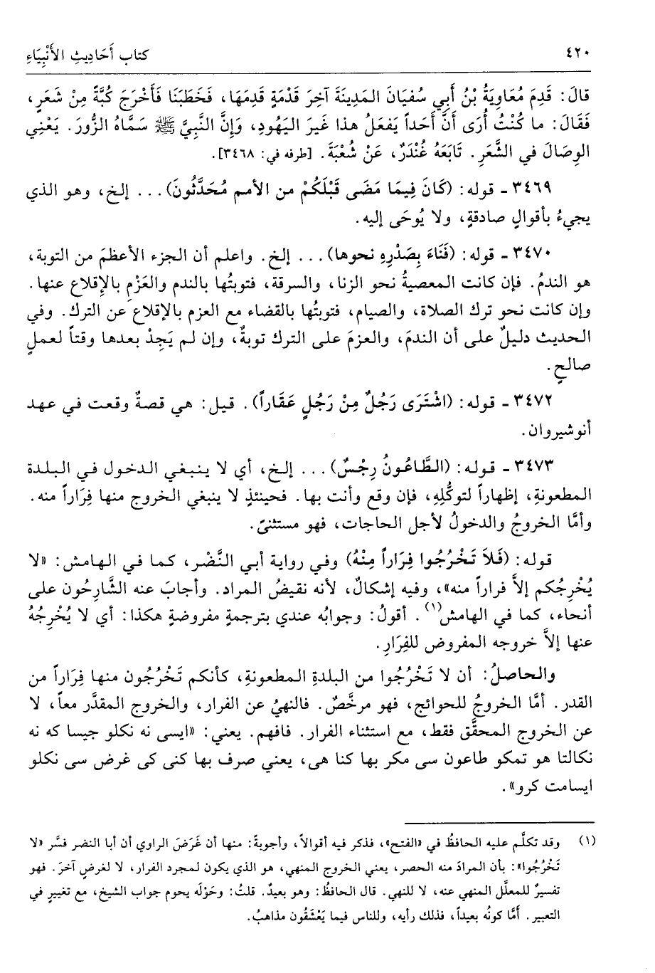 (¬1) وقد تكلَّم عليه الحافظُ في "الفتح"، فذكر فيه أقوالًا، وأجوبةً: منها أن غَرَضَ الراوي أن أبا النضر فسَّر "لا تَخْرُجُوا": بأن المرادَ منه الحصر، يعني الخروج المنهي، هو الذي يكون لمجرد الفرار، لا لغرضٍ آخرَ. فهو تفسيرٌ للمعلَّل المنهي عنه، لا للنهي. قال الحافظُ: وهو بعيدٌ. قلتُ: وحَولَه يحوم جواب الشيخ، مع تغييرٍ في التعبير. أمَّا كونُه بعيدًا، فذلك رأيه، وللناس فيما يَعْشَقُون مذاهبُ.