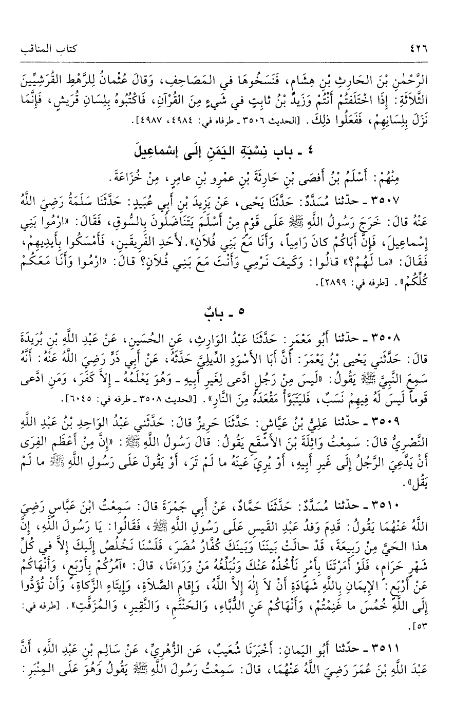 3510 - حَدَّثَنَا مُسَدَّدٌ حَدَّثَنَا حَمَّادٌ عَنْ أَبِى جَمْرَةَ قَالَ سَمِعْتُ ابْنَ عَبَّاسٍ - رضى الله عنهما - يَقُولُ قَدِمَ وَفْدُ عَبْدِ الْقَيْسِ عَلَى رَسُولِ اللَّهِ - صلى الله عليه وسلم - فَقَالُوا يَا رَسُولَ اللَّهِ إِنَّا مِنْ هَذَا الْحَىِّ مِنْ رَبِيعَةَ قَدْ حَالَتْ بَيْنَنَا وَبَيْنَكَ كُفَّارُ مُضَرَ، فَلَسْنَا نَخْلُصُ إِلَيْكَ إِلاَّ فِى كُلِّ شَهْرٍ حَرَامٍ، فَلَوْ أَمَرْتَنَا بِأَمْرٍ، نَأْخُذُهُ عَنْكَ، وَنُبَلِّغُهُ مَنْ وَرَاءَنَا. قَالَ «آمُرُكُمْ بِأَرْبَعٍ، وَأَنْهَاكُمْ عَنْ أَرْبَعٍ، الإِيمَانِ بِاللَّهِ شَهَادَةِ أَنْ لاَ إِلَهَ إِلاَّ اللَّهُ، وَإِقَامِ الصَّلاَةِ وَإِيتَاءِ الزَّكَاةِ، وَأَنْ تُؤَدُّوا إِلَى اللَّهِ خُمْسَ مَا غَنِمْتُمْ، وَأَنْهَاكُمْ عَنِ الدُّبَّاءِ، وَالْحَنْتَمِ، وَالنَّقِيرِ، وَالْمُزَفَّتِ». أطرافه 53، 87، 523، 1398، 3095، 4368، 4369، 6176، 7266، 7556 تحفة 6524