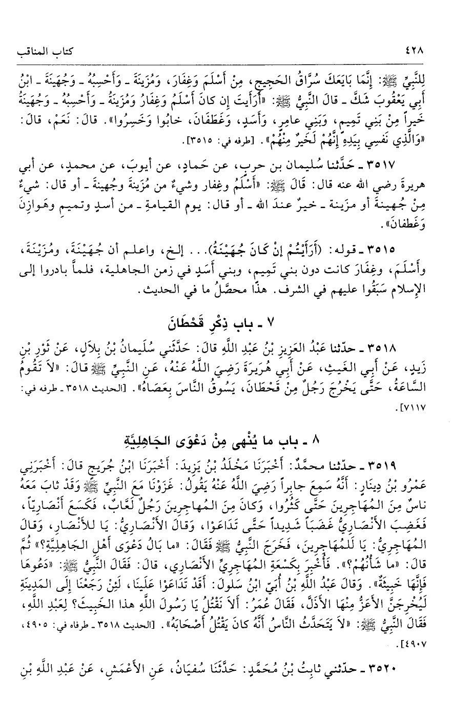 3517 - حَدَّثنا سُليمان بن حرب، عن حَمادٍ، عن أيوبَ، عن محمدٍ، عن أبي هريرةَ رضي الله عنه قال: قَالَ - صلى الله عليه وسلم -: "أَسلَمُ وغِفار وشيءٌ من مُزَينةَ وجُهينةَ -أو قال: شيءٌ مِنْ جُهينةَ أو مزَينة- خيرٌ عندَ الله -أو قال: يوم القيامةِ- من أسدٍ وتميمِ وهَوازِنَ وَغَطفانَ".