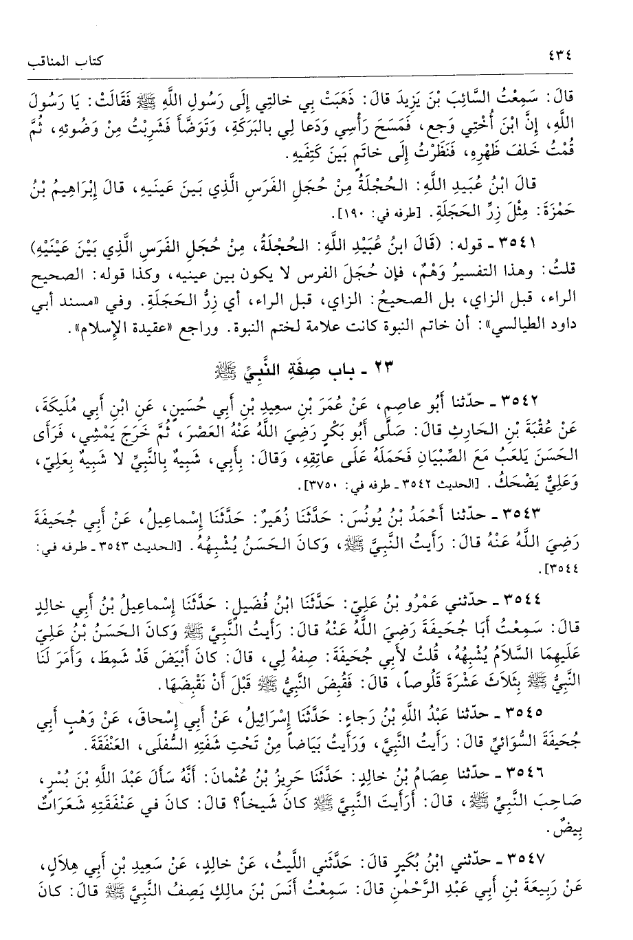3541 - قوله: (قَالَ ابنُ عُبَيْدِ اللَّهِ: الحُجْلَةُ، مِنْ حُجَلِ الفَرَسِ الَّذِي بَيْنَ عَيْنَيْهِ) قلتُ: وهذا التفسيرُ وَهْمٌ، فإن حُجَلَ الفرس لا يكون بين عينيه، وكذا قوله: الصحيح الراء، قبل الزاي، بل الصحيحُ: الزاي، قبل الراء، أي زِرُّ الحَجَلَةِ. وفي «مسند أبي داود الطيالسي»: أن خاتم النبوة كانت علامة لختم النبوة. وراجع «عقيدة الإِسلام».