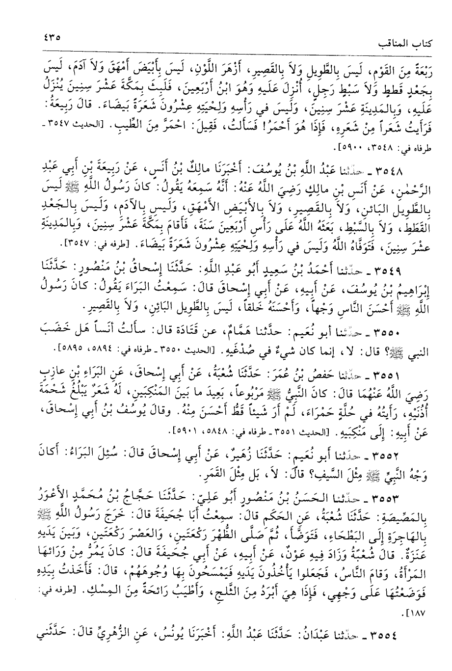 3550 - حَدَّثَنَا أَبُو نُعَيْمٍ حَدَّثَنَا هَمَّامٌ عَنْ قَتَادَةَ قَالَ سَأَلْتُ أَنَسًا هَلْ خَضَبَ النَّبِىُّ - صلى الله عليه وسلم - قَالَ لاَ، إِنَّمَا كَانَ شَىْءٌ فِى صُدْغَيْهِ. طرفاه 5894، 5895 - تحفة 1398