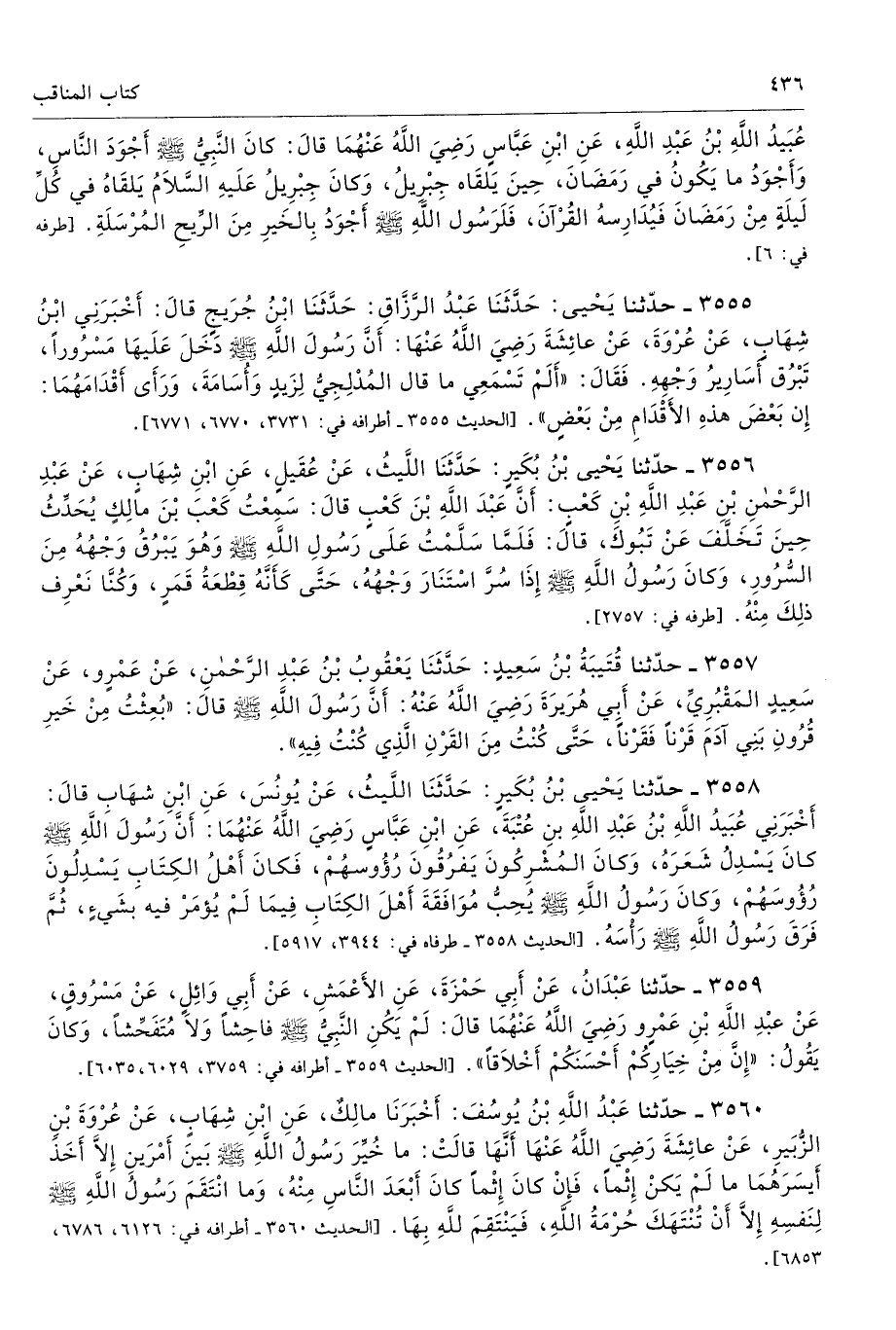 3556 - حَدَّثَنَا يَحْيَى بْنُ بُكَيْرٍ حَدَّثَنَا اللَّيْثُ عَنْ عُقَيْلٍ عَنِ ابْنِ شِهَابٍ عَنْ عَبْدِ الرَّحْمَنِ بْنِ عَبْدِ اللَّهِ بْنِ كَعْبٍ أَنَّ عَبْدَ اللَّهِ بْنَ كَعْبٍ قَالَ سَمِعْتُ كَعْبَ بْنَ مَالِكٍ يُحَدِّثُ حِينَ تَخَلَّفَ عَنْ تَبُوكَ قَالَ فَلَمَّا سَلَّمْتُ عَلَى رَسُولِ اللَّهِ - صلى الله عليه وسلم - وَهْوَ يَبْرُقُ وَجْهُهُ مِنَ السُّرُورِ، وَكَانَ رَسُولُ اللَّهِ - صلى الله عليه وسلم - إِذَا سُرَّ اسْتَنَارَ وَجْهُهُ، حَتَّى كَأَنَّهُ قِطْعَةُ قَمَرٍ، وَكُنَّا نَعْرِفُ ذَلِكَ مِنْهُ. أطرافه 2757، 2947، 2948، 2949، 2950، 3088، 3889، 3951، 4418، 4673، 4676، 4677، 4678، 6255، 6690، 7225 - تحفة 11131
