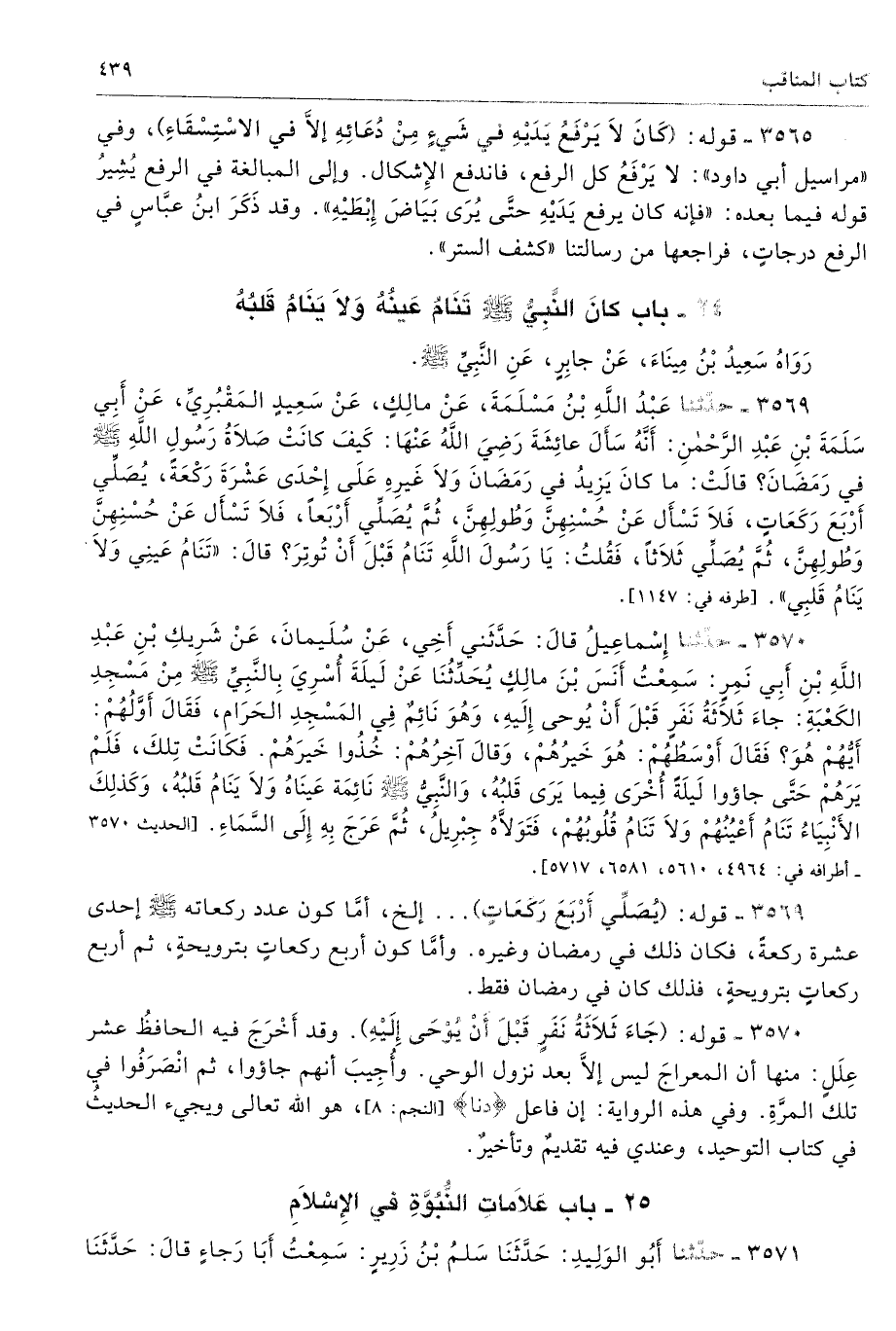 3569 - حَدَّثَنَا عَبْدُ اللَّهِ بْنُ مَسْلَمَةَ عَنْ مَالِكٍ عَنْ سَعِيدٍ الْمَقْبُرِىِّ عَنْ أَبِى سَلَمَةَ بْنِ عَبْدِ الرَّحْمَنِ أَنَّهُ سَأَلَ عَائِشَةَ - رضى الله عنها - كَيْفَ كَانَتْ صَلاَةُ رَسُولِ اللَّهِ - صلى الله عليه وسلم - فِى رَمَضَانَ قَالَتْ مَا كَانَ يَزِيدُ فِى رَمَضَانَ وَلاَ غَيْرِهِ عَلَى إِحْدَى عَشْرَةَ رَكْعَةً، يُصَلِّى أَرْبَعَ رَكَعَاتٍ فَلاَ تَسْأَلْ عَنْ حُسْنِهِنَّ وَطُولِهِنَّ، ثُمَّ يُصَلِّى أَرْبَعًا فَلاَ تَسْأَلْ عَنْ حُسْنِهِنَّ وَطُولِهِنَّ، ثُمَّ يُصَلِّى ثَلاَثًا فَقُلْتُ يَا رَسُولَ اللَّهِ تَنَامُ قَبْلَ أَنْ تُوتِرَ قَالَ «تَنَامُ عَيْنِى وَلاَ يَنَامُ قَلْبِى». طرفاه 1147، 2013 - تحفة 17719 - 232/ 4