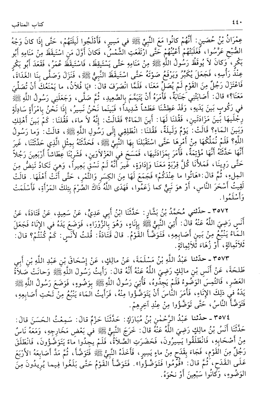 3572 - حَدَّثَنِى مُحَمَّدُ بْنُ بَشَّارٍ حَدَّثَنَا ابْنُ أَبِى عَدِىٍّ عَنْ سَعِيدٍ عَنْ قَتَادَةَ عَنْ أَنَسٍ - رضى الله عنه - قَالَ أُتِىَ النَّبِىُّ - صلى الله عليه وسلم - بِإِنَاءٍ وَهْوَ بِالزَّوْرَاءِ، فَوَضَعَ يَدَهُ فِى الإِنَاءِ، فَجَعَلَ الْمَاءُ يَنْبُعُ مِنْ بَيْنِ أَصَابِعِهِ، فَتَوَضَّأَ الْقَوْمُ. قَالَ قَتَادَةُ قُلْتُ لأَنَسٍ كَمْ كُنْتُمْ قَالَ ثَلاَثَمِائَةٍ، أَوْ زُهَاءَ ثَلاَثِمِائَةٍ. أطرافه 169، 195، 200، 3573، 3574، 3575 - تحفة1183