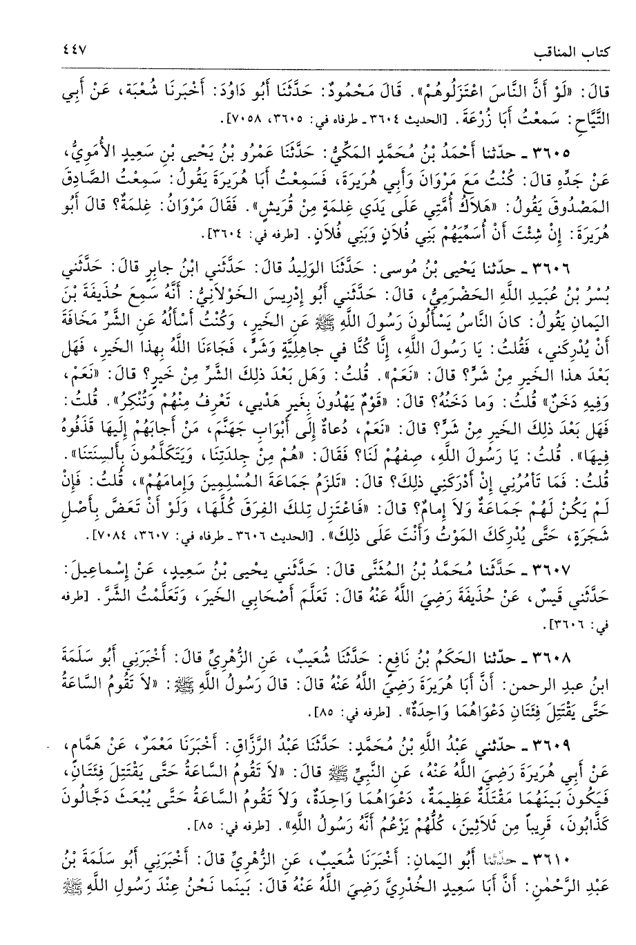 3607 - حَدَّثَنِى مُحَمَّدُ بْنُ الْمُثَنَّى قَالَ حَدَّثَنِى يَحْيَى بْنُ سَعِيدٍ عَنْ إِسْمَاعِيلَ حَدَّثَنِى قَيْسٌ عَنْ حُذَيْفَةَ - رضى الله عنه - قَالَ تَعَلَّمَ أَصْحَابِى الْخَيْرَ وَتَعَلَّمْتُ الشَّرَّ. طرفاه 3606، 7084 - تحفة 3380 - 243/ 4