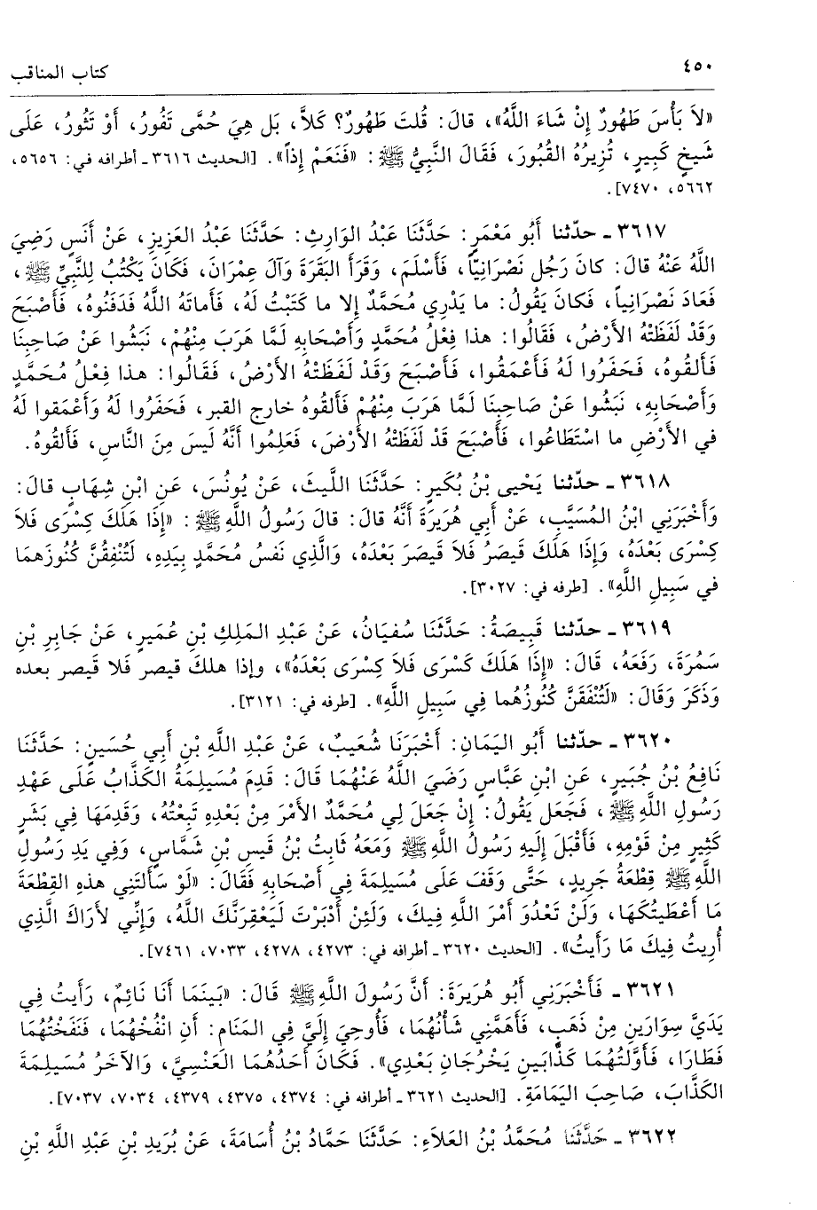3621 - فَأَخْبَرَنِى أَبُو هُرَيْرَةَ أَنَّ رَسُولَ اللَّهِ - صلى الله عليه وسلم - قَالَ «بَيْنَمَا أَنَا نَائِمٌ رَأَيْتُ فِى يَدَىَّ سِوَارَيْنِ مِنْ ذَهَبٍ، فَأَهَمَّنِى شَأْنُهُمَا، فَأُوحِىَ إِلَىَّ فِى الْمَنَامِ أَنِ انْفُخْهُمَا، فَنَفَخْتُهُمَا فَطَارَا فَأَوَّلْتُهُمَا كَذَّابَيْنِ يَخْرُجَانِ بَعْدِى». فَكَانَ أَحَدُهُمَا الْعَنْسِىَّ وَالآخَرُ مُسَيْلِمَةَ الْكَذَّابَ صَاحِبَ الْيَمَامَةِ. أطرافه 4374، 4375، 4379، 7034، 7037 - تحفة 13574
