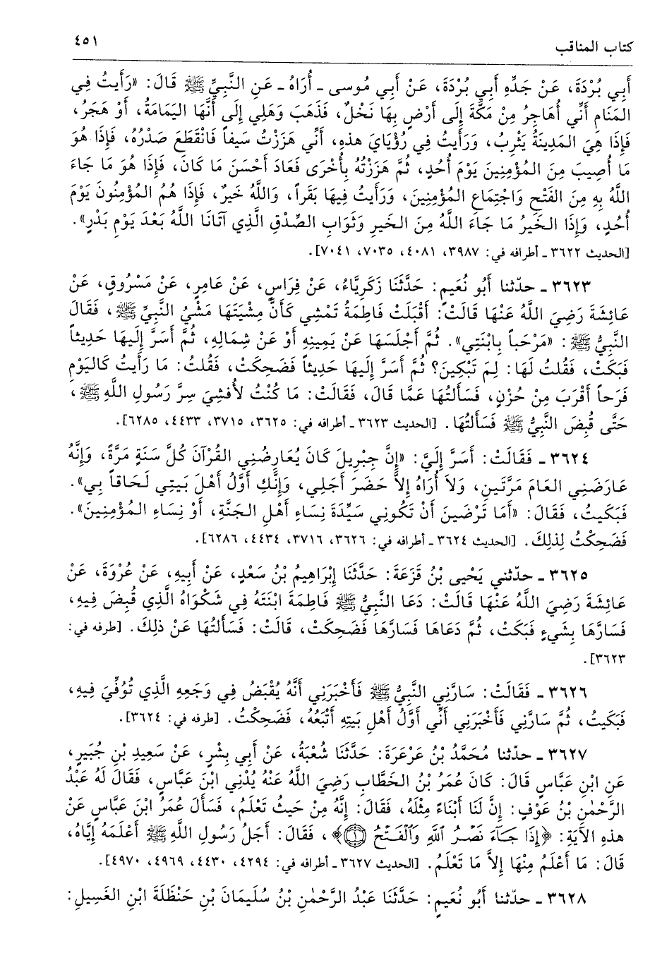 3624 - فَقَالَتْ أَسَرَّ إِلَىَّ «إِنَّ جِبْرِيلَ كَانَ يُعَارِضُنِى الْقُرْآنَ كُلَّ سَنَةٍ مَرَّةً، وَإِنَّهُ عَارَضَنِى الْعَامَ مَرَّتَيْنِ، وَلاَ أُرَاهُ إِلاَّ حَضَرَ أَجَلِى، وَإِنَّكِ أَوَّلُ أَهْلِ بَيْتِى لَحَاقًا بِى». فَبَكَيْتُ فَقَالَ «أَمَا تَرْضَيْنَ أَنْ تَكُونِى سَيِّدَةَ نِسَاءِ أَهْلِ الْجَنَّةِ - أَوْ نِسَاءِ الْمُؤْمِنِينَ». فَضَحِكْتُ لِذَلِكَ. أطرافه 3626، 3716، 4434، 6286 - تحفة 18040 ل