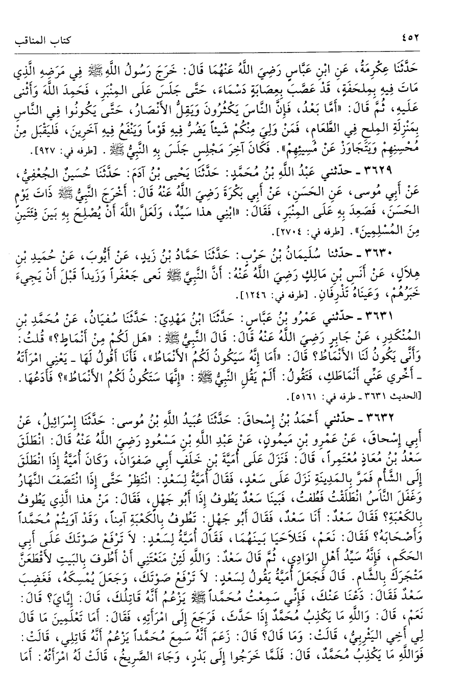 3629 - حَدَّثَنِى عَبْدُ اللَّهِ بْنُ مُحَمَّدٍ حَدَّثَنَا يَحْيَى بْنُ آدَمَ حَدَّثَنَا حُسَيْنٌ الْجُعْفِىُّ عَنْ أَبِى مُوسَى عَنِ الْحَسَنِ عَنْ أَبِى بَكْرَةَ - رضى الله عنه - أَخْرَجَ النَّبِىُّ - صلى الله عليه وسلم - ذَاتَ يَوْمٍ الْحَسَنَ فَصَعِدَ بِهِ عَلَى الْمِنْبَرِ، فَقَالَ «ابْنِى هَذَا سَيِّدٌ، وَلَعَلَّ اللَّهَ أَنْ يُصْلِحَ بِهِ بَيْنَ فِئَتَيْنِ مِنَ الْمُسْلِمِينَ». أطرافه 2704، 3746، 7109 - تحفة 11658