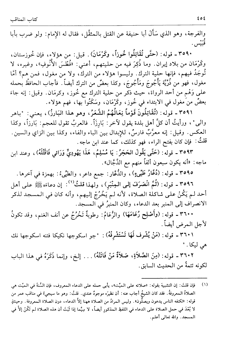 3590 - قوله: (حتَّى تُقَاتِلُوا خُوزًا، وكَرْمَانَ) قيل: من هؤلاء، فإن خُوزستان، وكَرْمَان من بلاد إيران. وما ذُكِرَ فيه من حليتهم، أعني: «فُطْسَ الأُنُوفِ»، وغيره، لا تُوجَدُ فيهم، فإنها حلية الترك. وليسوا هؤلاء من الترك، ولا من مغول، فمن هم؟ أمَّا مغول، فهو من ذُرِّيَّة يَأْجُوجَ ومَأْجُوجَ، وكذا بعضٌ من الترك أيضًا. فأجاب الحافظُ بحمله على وَهْمِ من أحد الرواة، حيث ذكر من حلية الترك مع خُوز، وكَرْمَان. وقيل: إنه جاءَ بعضٌ من مغول في الابتداء في خُوز، وكَرْمَان، وسَكَنُوا بها، فهم هؤلاء.