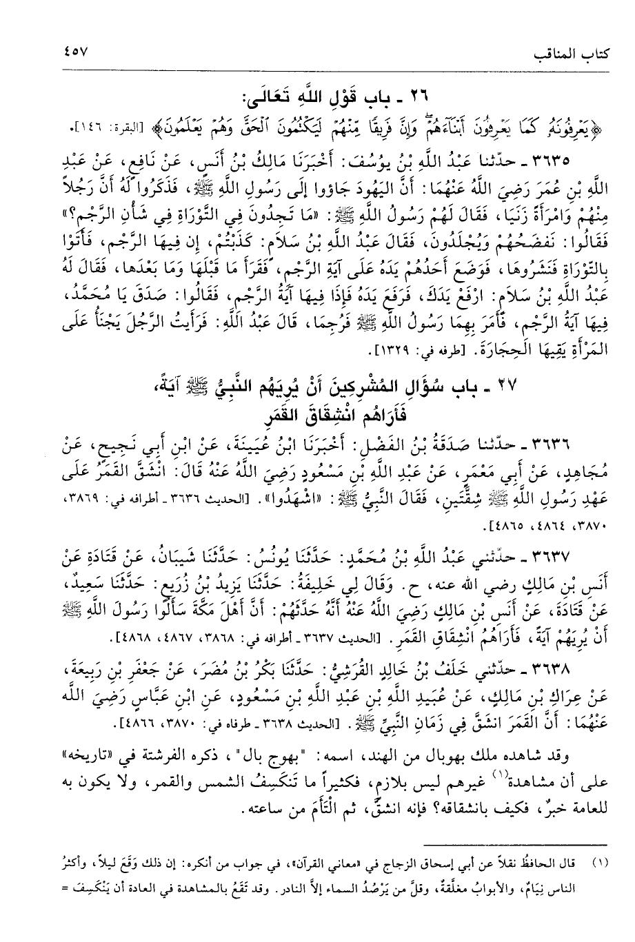 3638 - حَدَّثَنِى خَلَفُ بْنُ خَالِدٍ الْقُرَشِىُّ حَدَّثَنَا بَكْرُ بْنُ مُضَرَ عَنْ جَعْفَرِ بْنِ رَبِيعَةَ عَنْ عِرَاكِ بْنِ مَالِكٍ عَنْ عُبَيْدِ اللَّهِ بْنِ عَبْدِ اللَّهِ بْنِ مَسْعُودٍ عَنِ ابْنِ عَبَّاسٍ - رضى الله عنهما أَنَّ الْقَمَرَ انْشَقَّ فِى زَمَانِ النَّبِىِّ - صلى الله عليه وسلم -. طرافاه 3870، 4866 - تحفة 5831