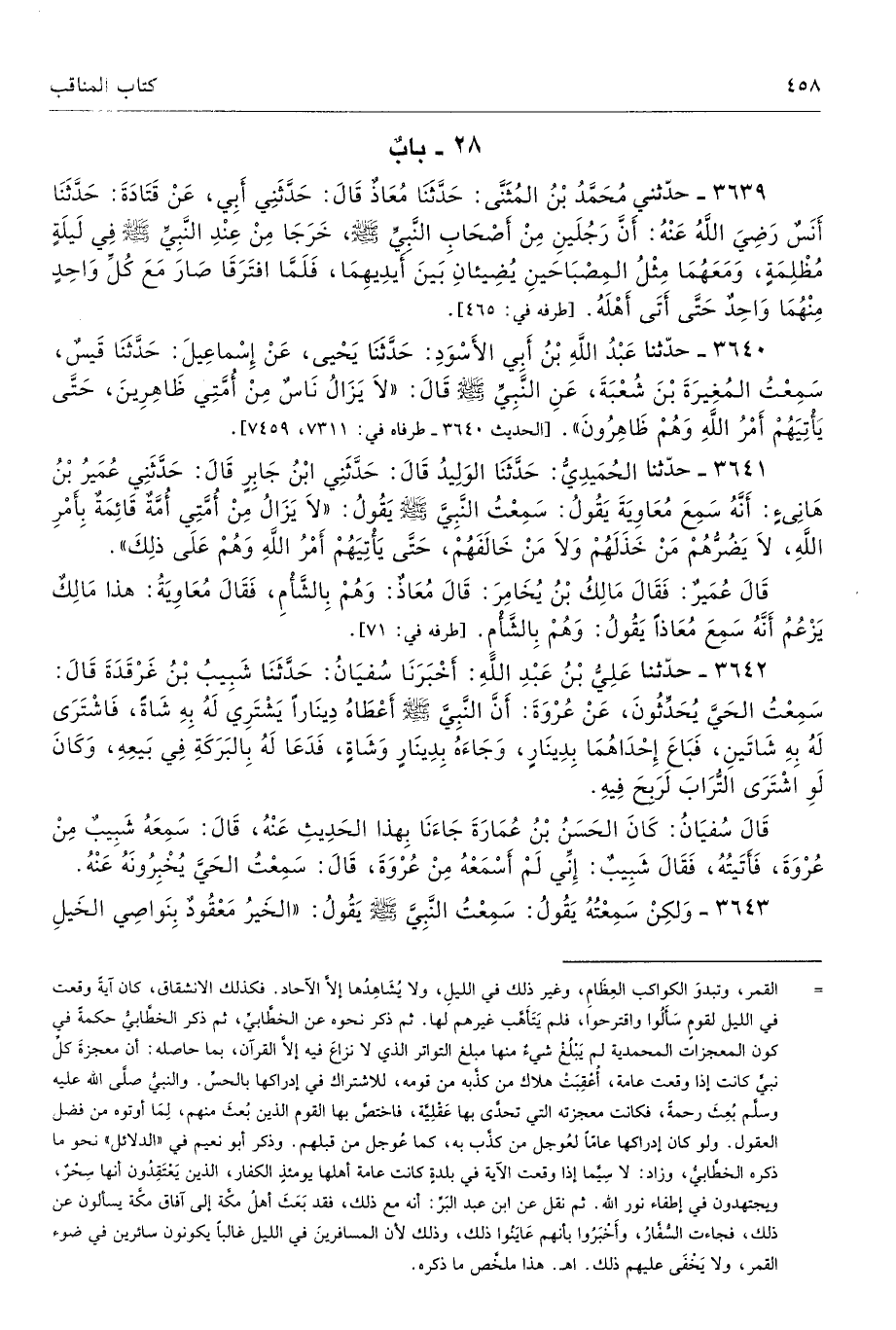3639 - حَدَّثَنِى مُحَمَّدُ بْنُ الْمُثَنَّى حَدَّثَنَا مُعَاذٌ قَالَ حَدَّثَنِى أَبِى عَنْ قَتَادَةَ حَدَّثَنَا أَنَسٌ - رضى الله عنه - أَنَّ رَجُلَيْنِ مِنْ أَصْحَابِ النَّبِىِّ - صلى الله عليه وسلم - خَرَجَا مِنْ عِنْدِ النَّبِىِّ - صلى الله عليه وسلم - فِى لَيْلَةٍ مُظْلِمَةٍ وَمَعَهُمَا مِثْلُ الْمِصْبَاحَيْنِ، يُضِيآنِ بَيْنَ أَيْدِيهِمَا، فَلَمَّا افْتَرَقَا صَارَ مَعَ كُلِّ وَاحِدٍ مِنْهُمَا وَاحِدٌ حَتَّى أَتَى أَهْلَهُ. طرفاه 465، 3805 - تحفة 1372 - 252/ 4