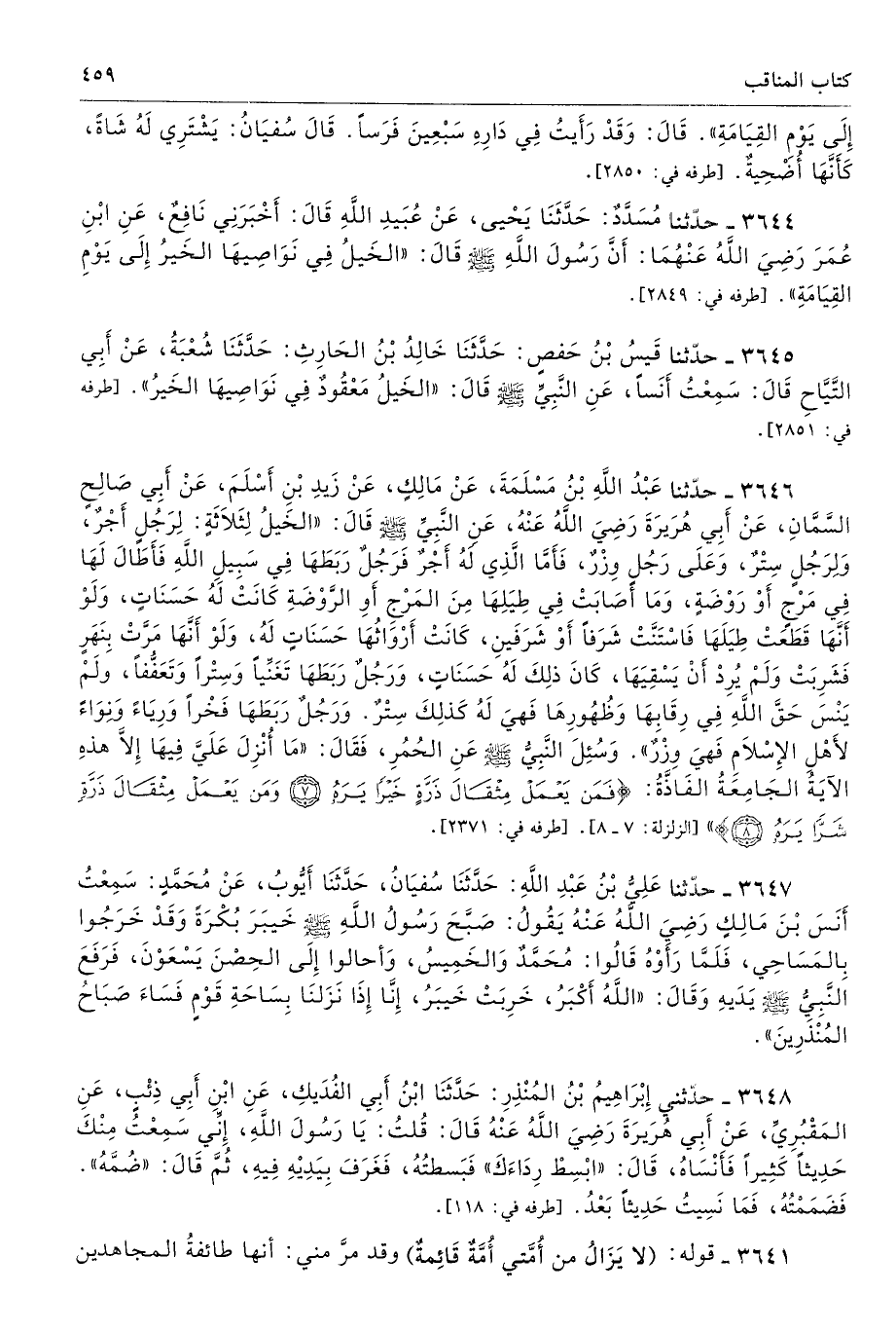 3644 - حَدَّثَنَا مُسَدَّدٌ حَدَّثَنَا يَحْيَى عَنْ عُبَيْدِ اللَّهِ قَالَ أَخْبَرَنِى نَافِعٌ عَنِ ابْنِ عُمَرَ - رضى الله عنهما - أَنَّ رَسُولَ اللَّهِ - صلى الله عليه وسلم - قَالَ «الْخَيْلُ فِى نَوَاصِيهَا الْخَيْرُ إِلَى يَوْمِ الْقِيَامَةِ». طرفه 2849 - تحفة 8168