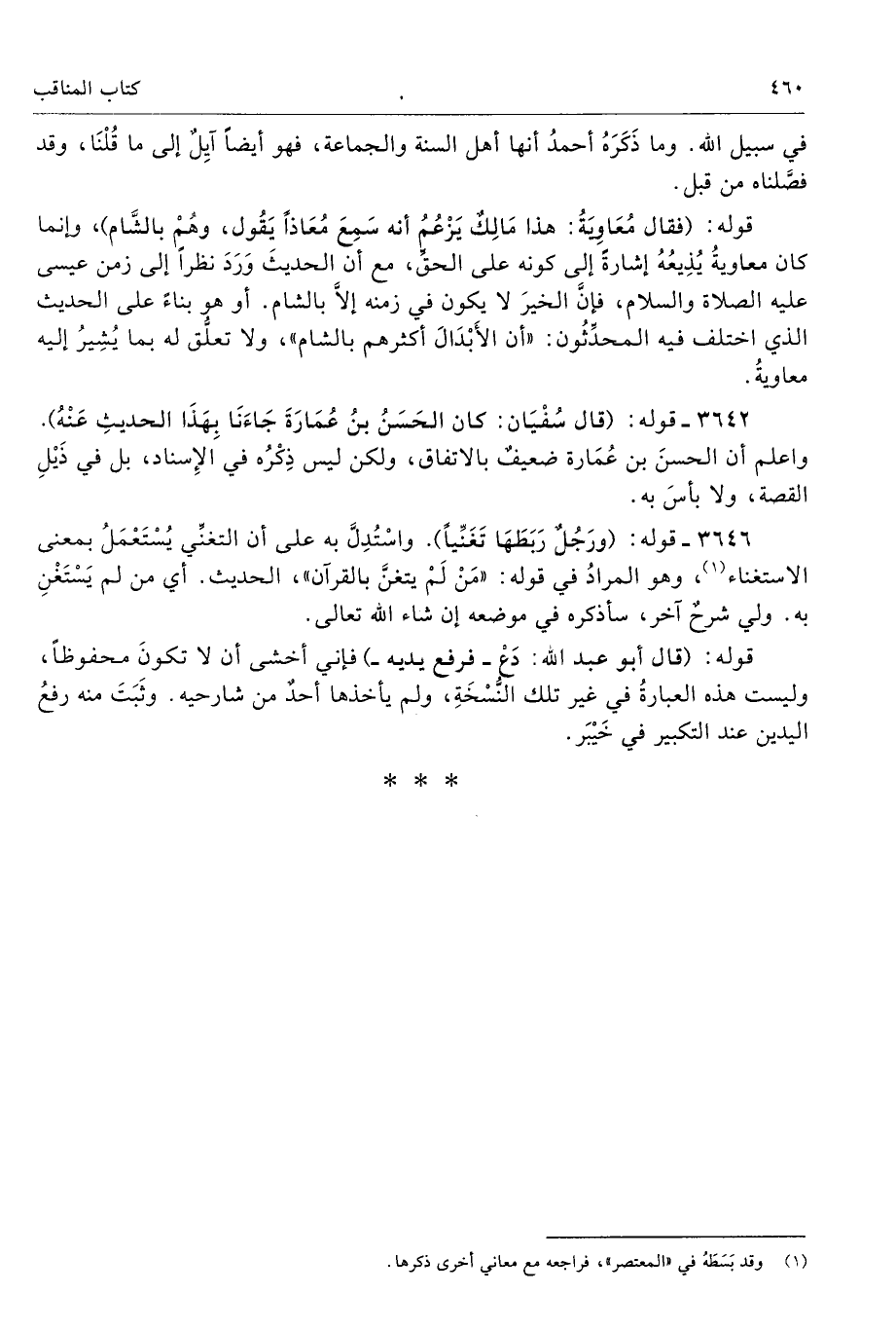 3646 - قوله: (ورَجُلٌ رَبَطَهَا تَغَنِّيًا) واسْتُدِلَّ به على أن التغنِّي يُسْتَعْمَلُ بمعنى الاستغناء (¬1)، وهو المرادُ في قوله: «مَنْ لَمْ يتغنَّ بالقرآن»»، الحديث. أي من لم يَسْتَغْنِ به. ولي شرحٌ آخر، سأذكره في موضعه إن شاء الله تعالى.