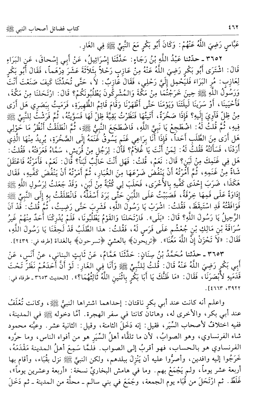 3652 - حَدَّثَنَا عَبْدُ اللَّهِ بْنُ رَجَاءٍ حَدَّثَنَا إِسْرَائِيلُ عَنْ أَبِى إِسْحَاقَ عَنِ الْبَرَاءِ قَالَ اشْتَرَى أَبُو بَكْرٍ - رضى الله عنه - مِنْ عَازِبٍ رَحْلاً بِثَلاَثَةَ عَشَرَ دِرْهَمًا فَقَالَ أَبُو بَكْرٍ لِعَازِبٍ مُرِ الْبَرَاءَ فَلْيَحْمِلْ إِلَىَّ رَحْلِى. فَقَالَ عَازِبٌ لاَ حَتَّى تُحَدِّثَنَا كَيْفَ صَنَعْتَ أَنْتَ وَرَسُولُ اللَّهِ - صلى الله عليه وسلم - حِينَ خَرَجْتُمَا مِنْ مَكَّةَ وَالْمُشْرِكُونَ يَطْلُبُونَكُمْ قَالَ ارْتَحَلْنَا مِنْ مَكَّةَ، فَأَحْيَيْنَا أَوْ سَرَيْنَا لَيْلَتَنَا وَيَوْمَنَا حَتَّى أَظْهَرْنَا وَقَامَ قَائِمُ الظَّهِيرَةِ، فَرَمَيْتُ بِبَصَرِى هَلْ أَرَى مِنْ ظِلٍّ فَآوِىَ إِلَيْهِ، فَإِذَا صَخْرَةٌ أَتَيْتُهَا فَنَظَرْتُ بَقِيَّةَ ظِلٍّ لَهَا فَسَوَّيْتُهُ، ثُمَّ فَرَشْتُ لِلنَّبِىِّ - صلى الله عليه وسلم - فِيهِ، ثُمَّ قُلْتُ لَهُ اضْطَجِعْ يَا نَبِىَّ اللَّهِ. فَاضْطَجَعَ النَّبِىُّ - صلى الله عليه وسلم - ثُمَّ انْطَلَقْتُ أَنْظُرُ مَا حَوْلِى، هَلْ أَرَى مِنَ الطَّلَبِ أَحَدًا فَإِذَا أَنَا بِرَاعِى غَنَمٍ يَسُوقُ غَنَمَهُ إِلَى الصَّخْرَةِ يُرِيدُ مِنْهَا الَّذِى أَرَدْنَا، فَسَأَلْتُهُ فَقُلْتُ لَهُ لِمَنْ أَنْتَ يَا غُلاَمُ قَالَ لِرَجُلٍ مِنْ قُرَيْشٍ سَمَّاهُ فَعَرَفْتُهُ. فَقُلْتُ هَلْ فِى غَنَمِكَ مِنْ لَبَنٍ قَالَ نَعَمْ. قُلْتُ فَهَلْ أَنْتَ حَالِبٌ لَبَنًا قَالَ نَعَمْ. فَأَمَرْتُهُ فَاعْتَقَلَ شَاةً مِنْ غَنَمِهِ، ثُمَّ أَمَرْتُهُ أَنْ يَنْفُضَ ضَرْعَهَا مِنَ الْغُبَارِ، ثُمَّ أَمَرْتُهُ أَنْ يَنْفُضَ كَفَّيْهِ، فَقَالَ هَكَذَا ضَرَبَ إِحْدَى كَفَّيْهِ بِالأُخْرَى فَحَلَبَ لِى كُثْبَةً مِنْ لَبَنٍ، وَقَدْ جَعَلْتُ لِرَسُولِ اللَّهِ - صلى الله عليه وسلم - إِدَاوَةً عَلَى فَمِهَا خِرْقَةٌ، فَصَبَبْتُ عَلَى اللَّبَنِ حَتَّى بَرَدَ أَسْفَلُهُ، فَانْطَلَقْتُ بِهِ إِلَى النَّبِىِّ - صلى الله عليه وسلم - فَوَافَقْتُهُ قَدِ اسْتَيْقَظَ، فَقُلْتُ اشْرَبْ يَا رَسُولَ اللَّهِ. فَشَرِبَ حَتَّى رَضِيتُ ثُمَّ قُلْتُ قَدْ آنَ الرَّحِيلُ يَا رَسُولَ اللَّهِ. قَالَ «بَلَى». فَارْتَحَلْنَا وَالْقَوْمُ يَطْلُبُونَا، فَلَمْ يُدْرِكْنَا أَحَدٌ مِنْهُمْ غَيْرُ سُرَاقَةَ بْنِ مَالِكِ بْنِ جُعْشُمٍ عَلَى فَرَسٍ لَهُ. فَقُلْتُ هَذَا الطَّلَبُ قَدْ لَحِقَنَا يَا رَسُولَ اللَّهِ. فَقَالَ «لاَ تَحْزَنْ إِنَّ اللَّهَ مَعَنَا». {تُرِيحُونَ} بالعشي {تَسْرَحُونَ} بالغداة أطرافه 2439، 3615، 3908، 3917، 5607 - تحفة 6587 - 4/ 5