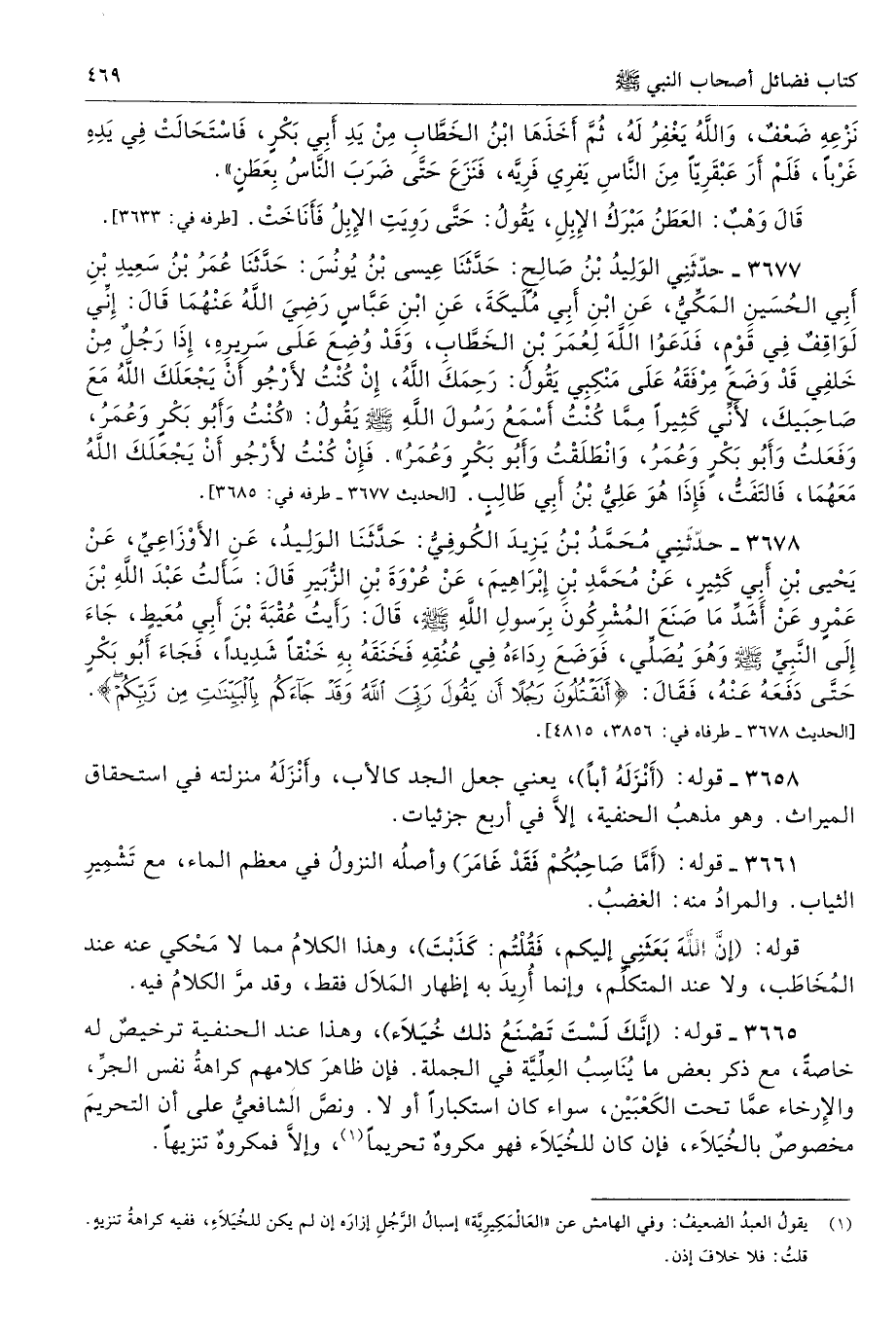 3665 - قوله: (إنَّكَ لَسْتَ تَصْنَعُ ذلك خُيَلاَء)، وهذا عند الحنفية ترخيصٌ له خاصةً، مع ذكر بعض ما يُنَاسِبُ العِلِّيَّة في الجملة. فإن ظاهرَ كلامهم كراهةُ نفس الجرِّ، والإِرخاء عمَّا تحت الكَعْبَيْن، سواء كان استكبارًا أو لا. ونصَّ الشافعيُّ على أن التحريمَ مخصوصٌ بالخُيَلاَء، فإن كان للخُيَلاَء فهو مكروهٌ تحريمًا (¬1)، وإلاَّ فمكروهٌ تنزيهًا.