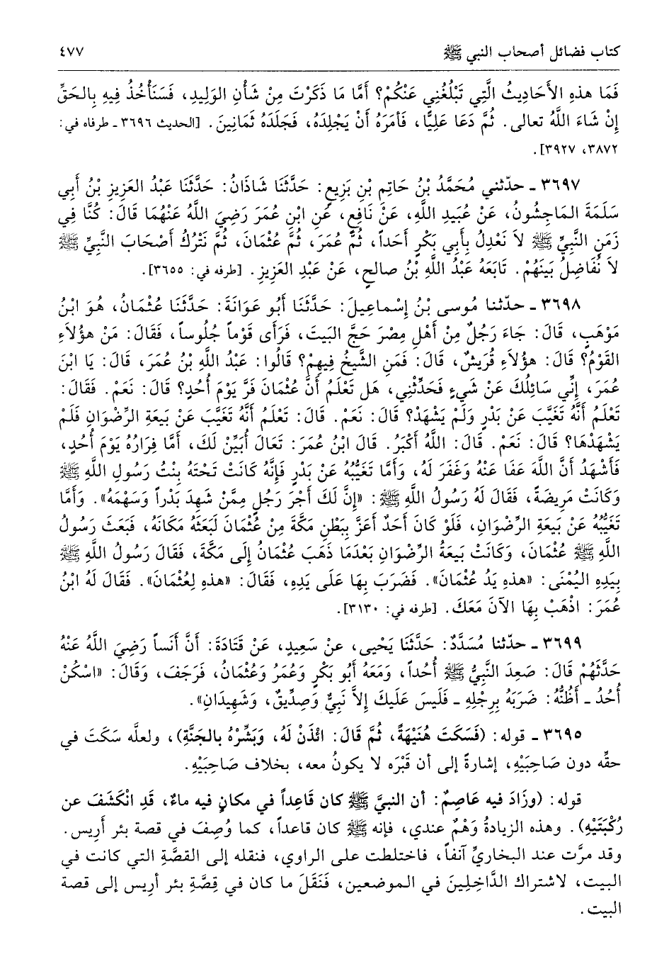 3698 - حَدَّثَنَا مُوسَى بْنُ إِسْمَاعِيلَ حَدَّثَنَا أَبُو عَوَانَةَ حَدَّثَنَا عُثْمَانُ - هُوَ ابْنُ مَوْهَبٍ - قَالَ جَاءَ رَجُلٌ مَنْ أَهْلِ مِصْرَ حَجَّ الْبَيْتَ فَرَأَى قَوْمًا جُلُوسًا، فَقَالَ مَنْ هَؤُلاَءِ الْقَوْمُ قَالَ هَؤُلاَءِ قُرَيْشٌ. قَالَ فَمَنِ الشَّيْخُ فِيهِمْ قَالُوا عَبْدُ اللَّهِ بْنُ عُمَرَ. قَالَ يَا ابْنَ عُمَرَ إِنِّى سَائِلُكَ عَنْ شَىْءٍ فَحَدِّثْنِى هَلْ تَعْلَمُ أَنَّ عُثْمَانَ فَرَّ يَوْمَ أُحُدٍ قَالَ نَعَمْ. قَالَ تَعْلَمُ أَنَّهُ تَغَيَّبَ عَنْ بَدْرٍ وَلَمْ يَشْهَدْ قَالَ نَعَمْ. قَالَ تَعْلَمُ أَنَّهُ تَغَيَّبَ عَنْ بَيْعَةِ الرُّضْوَانِ فَلَمْ يَشْهَدْهَا قَالَ نَعَمْ. قَالَ اللَّهُ أَكْبَرُ. قَالَ ابْنُ عُمَرَ تَعَالَ أُبَيِّنْ لَكَ أَمَّا فِرَارُهُ يَوْمَ أُحُدٍ فَأَشْهَدُ أَنَّ اللَّهَ عَفَا عَنْهُ وَغَفَرَ لَهُ، وَأَمَّا تَغَيُّبُهُ عَنْ بَدْرٍ، فَإِنَّهُ كَانَتْ تَحْتَهُ بِنْتُ رَسُولِ اللَّهِ - صلى الله عليه وسلم - وَكَانَتْ مَرِيضَةً، فَقَالَ لَهُ رَسُولُ اللَّهِ - صلى الله عليه وسلم - «إِنَّ لَكَ أَجْرَ رَجُلٍ مِمَّنْ شَهِدَ بَدْرًا وَسَهْمَهُ». وَأَمَّا تَغَيُّبُهُ عَنْ بَيْعَةِ الرُّضْوَانِ فَلَوْ كَانَ أَحَدٌ أَعَزَّ بِبَطْنِ مَكَّةَ مِنْ عُثْمَانَ لَبَعَثَهُ مَكَانَهُ فَبَعَثَ رَسُولُ اللَّهِ - صلى الله عليه وسلم - عُثْمَانَ وَكَانَتْ بَيْعَةُ الرُّضْوَانِ بَعْدَ مَا ذَهَبَ عُثْمَانُ إِلَى مَكَّةَ، فَقَالَ رَسُولُ اللَّهِ - صلى الله عليه وسلم - بِيَدِهِ الْيُمْنَى «هَذِهِ يَدُ عُثْمَانَ». فَضَرَبَ بِهَا عَلَى يَدِهِ، فَقَالَ «هَذِهِ لِعُثْمَانَ». فَقَالَ لَهُ ابْنُ عُمَرَ اذْهَبْ بِهَا الآنَ مَعَكَ. أطرافه 3130، 3704، 4066، 4513، 4514، 4650، 4651، 7095 تحفة 7319 - 19/ 5