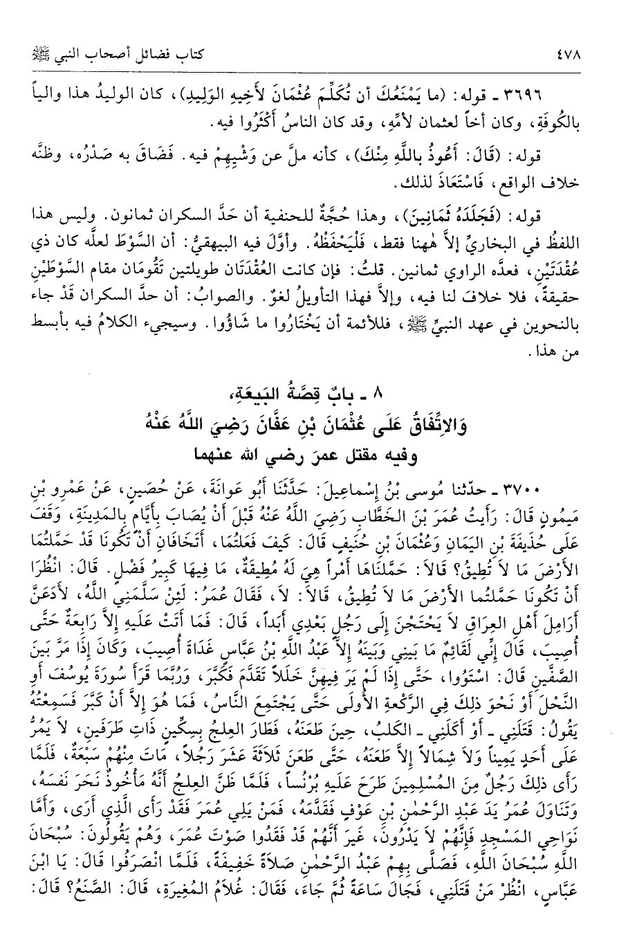 3696 - قوله: (ما يَمْنَعُكَ أن تُكَلِّمَ عُثْمَانَ لأَخِيهِ الوَلِيدِ)، كان الوليدُ هذا واليًا بالكُوفَةِ، وكان أخًا لعثمان لأمِّهِ، وقد كان الناسُ أَكْثَرُوا فيه.