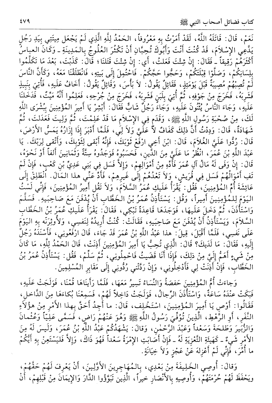 نَعَمْ. قَالَ قَاتَلَهُ اللَّهُ لَقَدْ أَمَرْتُ بِهِ مَعْرُوفًا، الْحَمْدُ لِلَّهِ الَّذِى لَمْ يَجْعَلْ مَنِيَّتِى بِيَدِ رَجُلٍ يَدَّعِى الإِسْلاَمَ، قَدْ كُنْتَ أَنْتَ وَأَبُوكَ تُحِبَّانِ أَنْ تَكْثُرَ الْعُلُوجُ بِالْمَدِينَةِ وَكَانَ {الْعَبَّاسُ} أَكْثَرَهُمْ رَقِيقًا. فَقَالَ إِنْ شِئْتَ فَعَلْتُ. أَىْ إِنْ شِئْتَ قَتَلْنَا. قَالَ كَذَبْتَ، بَعْدَ مَا تَكَلَّمُوا بِلِسَانِكُمْ، وَصَلَّوْا قِبْلَتَكُمْ وَحَجُّوا حَجَّكُمْ فَاحْتُمِلَ إِلَى بَيْتِهِ فَانْطَلَقْنَا مَعَهُ، وَكَأَنَّ النَّاسَ لَمْ تُصِبْهُمْ مُصِيبَةٌ قَبْلَ يَوْمَئِذٍ، فَقَائِلٌ يَقُولُ لاَ بَأْسَ. وَقَائِلٌ يَقُولُ أَخَافُ عَلَيْهِ، فَأُتِىَ بِنَبِيذٍ فَشَرِبَهُ فَخَرَجَ مِنْ جَوْفِهِ، ثُمَّ أُتِىَ بِلَبَنٍ فَشَرِبَهُ فَخَرَجَ مِنْ جُرْحِهِ، فَعَلِمُوا أَنَّهُ مَيِّتٌ، فَدَخَلْنَا عَلَيْهِ، وَجَاءَ النَّاسُ يُثْنُونَ عَلَيْهِ، وَجَاءَ رَجُلٌ شَابٌّ، فَقَالَ أَبْشِرْ يَا أَمِيرَ الْمُؤْمِنِينَ بِبُشْرَى اللَّهِ لَكَ مِنْ صُحْبَةِ رَسُولِ اللَّهِ - صلى الله عليه وسلم - وَقَدَمٍ فِى الإِسْلاَمِ مَا قَدْ عَلِمْتَ، ثُمَّ وَلِيتَ فَعَدَلْتَ، ثُمَّ شَهَادَةٌ. قَالَ وَدِدْتُ أَنَّ ذَلِكَ كَفَافٌ لاَ عَلَىَّ وَلاَ لِى. فَلَمَّا أَدْبَرَ، إِذَا إِزَارُهُ يَمَسُّ الأَرْضَ. قَالَ رُدُّوا عَلَىَّ الْغُلاَمَ قَالَ ابْنَ أَخِى ارْفَعْ ثَوْبَكَ، فَإِنَّهُ أَبْقَى لِثَوْبِكَ وَأَتْقَى لِرَبِّكَ، يَا عَبْدَ اللَّهِ بْنَ عُمَرَ انْظُرْ مَا عَلَىَّ مِنَ الدَّيْنِ. فَحَسَبُوهُ فَوَجَدُوهُ سِتَّةً وَثَمَانِينَ أَلْفًا أَوْ نَحْوَهُ، قَالَ إِنْ وَفَى لَهُ مَالُ آلِ عُمَرَ، فَأَدِّهِ مِنْ أَمْوَالِهِمْ، وَإِلاَّ فَسَلْ فِى بَنِى عَدِىِّ بْنِ كَعْبٍ، فَإِنْ لَمْ تَفِ أَمْوَالُهُمْ فَسَلْ فِى قُرَيْشٍ، وَلاَ تَعْدُهُمْ إِلَى غَيْرِهِمْ، فَأَدِّ عَنِّى هَذَا الْمَالَ، انْطَلِقْ إِلَى عَائِشَةَ أُمِّ الْمُؤْمِنِينَ فَقُلْ يَقْرَأُ عَلَيْكِ عُمَرُ السَّلاَمَ. وَلاَ تَقُلْ أَمِيرُ الْمُؤْمِنِينَ. فَإِنِّى لَسْتُ الْيَوْمَ لِلْمُؤْمِنِينَ أَمِيرًا، وَقُلْ يَسْتَأْذِنُ عُمَرُ بْنُ الْخَطَّابِ أَنْ يُدْفَنَ مَعَ صَاحِبَيْهِ. فَسَلَّمَ وَاسْتَأْذَنَ، ثُمَّ دَخَلَ عَلَيْهَا، فَوَجَدَهَا قَاعِدَةً تَبْكِى فَقَالَ يَقْرَأُ عَلَيْكِ عُمَرُ بْنُ الْخَطَّابِ السَّلاَمَ وَيَسْتَأْذِنُ أَنْ يُدْفَنَ مَعَ صَاحِبَيْهِ. فَقَالَتْ كُنْتُ أُرِيدُهُ لِنَفْسِى، وَلأُوثِرَنَّ بِهِ الْيَوْمَ عَلَى نَفْسِى. فَلَمَّا أَقْبَلَ قِيلَ هَذَا عَبْدُ اللَّهِ بْنُ عُمَرَ قَدْ جَاءَ. قَالَ ارْفَعُونِى، فَأَسْنَدَهُ رَجُلٌ إِلَيْهِ، فَقَالَ مَا لَدَيْكَ قَالَ الَّذِى تُحِبُّ يَا أَمِيرَ الْمُؤْمِنِينَ أَذِنَتْ. قَالَ الْحَمْدُ لِلَّهِ، مَا كَانَ مِنْ شَىْءٍ أَهَمُّ إِلَىَّ مِنْ ذَلِكَ، فَإِذَا أَنَا قَضَيْتُ فَاحْمِلُونِى ثُمَّ سَلِّمْ فَقُلْ يَسْتَأْذِنُ عُمَرُ بْنُ الْخَطَّابِ، فَإِنْ أَذِنَتْ لِى فَأَدْخِلُونِى، وَإِنْ رَدَّتْنِى رُدُّونِى إِلَى مَقَابِرِ الْمُسْلِمِينَ. وَجَاءَتْ أُمُّ الْمُؤْمِنِينَ حَفْصَةُ وَالنِّسَاءُ تَسِيرُ مَعَهَا، فَلَمَّا رَأَيْنَاهَا قُمْنَا، فَوَلَجَتْ عَلَيْهِ فَبَكَتْ عِنْدَهُ سَاعَةً، وَاسْتَأْذَنَ الرِّجَالُ، فَوَلَجَتْ دَاخِلاً لَهُمْ، فَسَمِعْنَا بُكَاءَهَا مِنَ الدَّاخِلِ. فَقَالُوا أَوْصِ يَا أَمِيرَ الْمُؤْمِنِينَ اسْتَخْلِفْ. قَالَ مَا أَجِدُ أَحَقَّ بِهَذَا الأَمْرِ مِنْ هَؤُلاَءِ النَّفَرِ أَوِ الرَّهْطِ الَّذِينَ تُوُفِّىَ رَسُولُ اللَّهِ - صلى الله عليه وسلم - وَهْوَ عَنْهُمْ رَاضٍ. فَسَمَّى عَلِيًّا وَعُثْمَانَ وَالزُّبَيْرَ وَطَلْحَةَ وَسَعْدًا وَعَبْدَ الرَّحْمَنِ وَقَالَ يَشْهَدُكُمْ