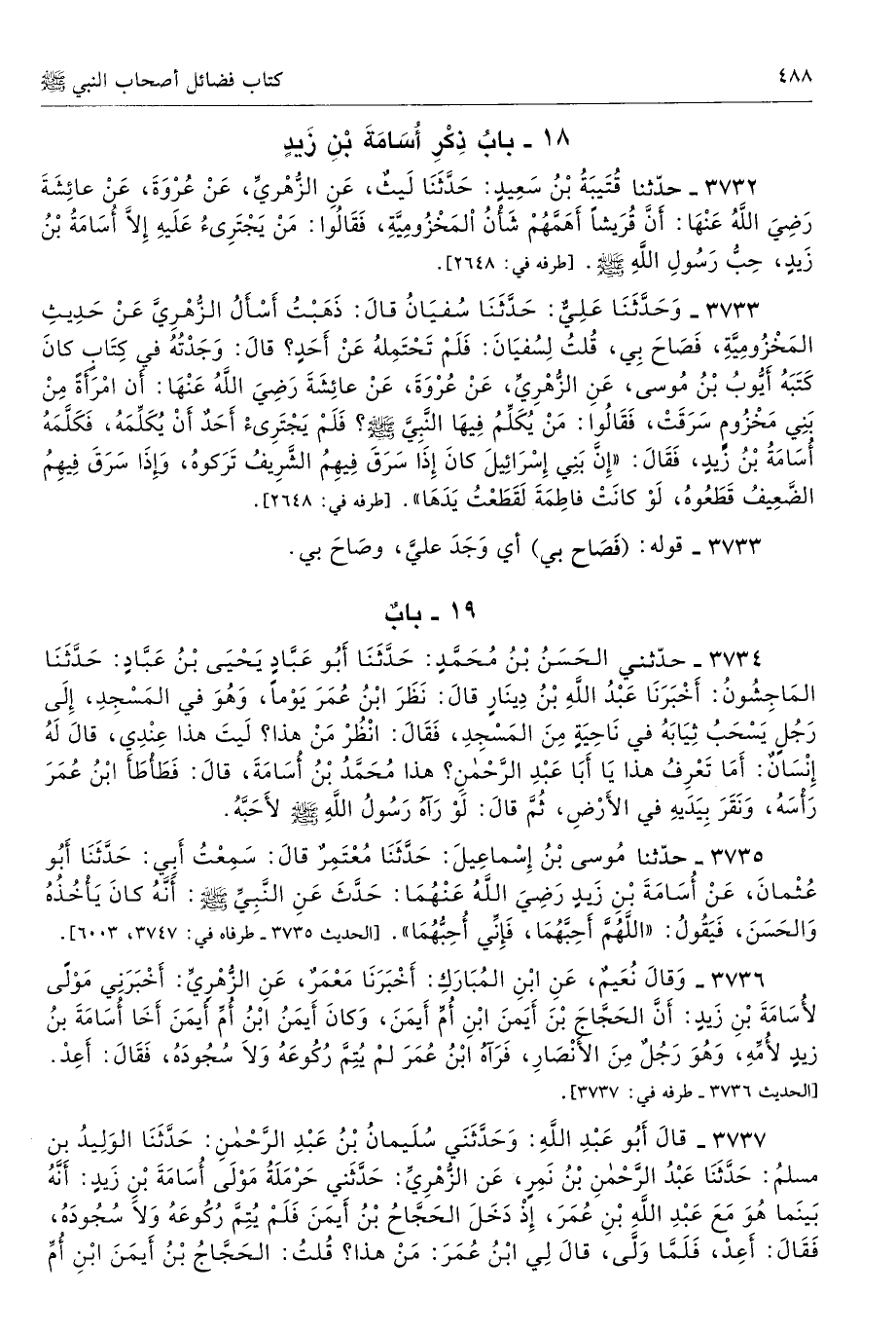 3732 - حَدَّثَنَا قُتَيْبَةُ بْنُ سَعِيدٍ حَدَّثَنَا لَيْثٌ عَنِ الزُّهْرِىِّ عَنْ عُرْوَةَ عَنْ عَائِشَةَ رضى الله عنها أَنَّ قُرَيْشًا أَهَمَّهُمْ شَأْنُ الْمَخْزُومِيَّةِ، فَقَالُوا مَنْ يَجْتَرِئُ عَلَيْهِ إِلاَّ أُسَامَةُ بْنُ زَيْدٍ، حِبُّ رَسُولِ اللَّهِ - صلى الله عليه وسلم -. أطرافه 2648، 3475، 3733، 4304، 6787، 6788، 6800 - تحفة 16578