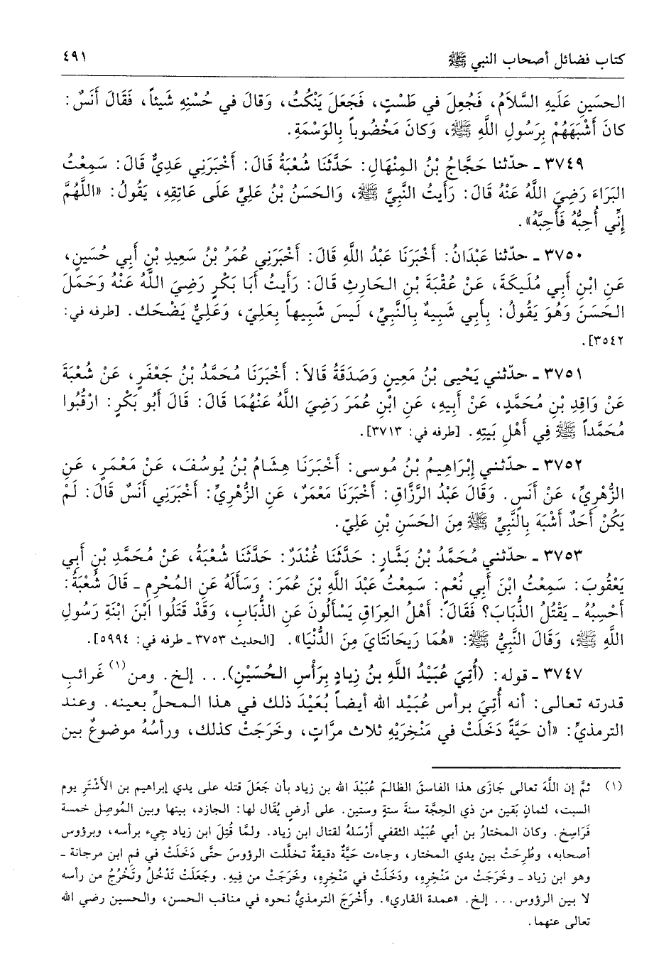 3753 - حَدَّثَنِى مُحَمَّدُ بْنُ بَشَّارٍ حَدَّثَنَا غُنْدَرٌ حَدَّثَنَا شُعْبَةُ عَنْ مُحَمَّدِ بْنِ أَبِى يَعْقُوبَ سَمِعْتُ ابْنَ أَبِى نُعْمٍ سَمِعْتُ عَبْدَ اللَّهِ بْنَ عُمَرَ وَسَأَلَهُ عَنِ الْمُحْرِمِ، قَالَ شُعْبَةُ أَحْسِبُهُ يَقْتُلُ الذُّبَابَ فَقَالَ أَهْلُ الْعِرَاقِ يَسْأَلُونَ عَنِ الذُّبَابِ وَقَدْ قَتَلُوا ابْنَ ابْنَةِ رَسُولِ اللَّهِ - صلى الله عليه وسلم -، وَقَالَ النَّبِىُّ - صلى الله عليه وسلم - «هُمَا رَيْحَانَتَاىَ مِنَ الدُّنْيَا». طرفه 5994 - تحفة 7300