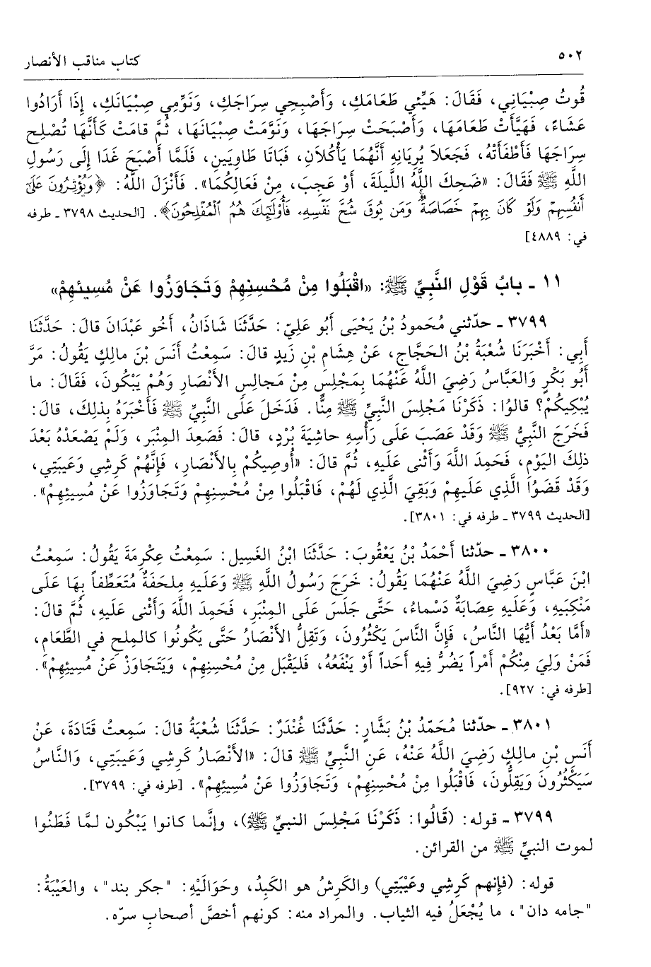 3799 - حَدَّثَنِى مُحَمَّدُ بْنُ يَحْيَى أَبُو عَلِىٍّ حَدَّثَنَا شَاذَانُ أَخُو عَبْدَانَ حَدَّثَنَا أَبِى أَخْبَرَنَا شُعْبَةُ بْنُ الْحَجَّاجِ عَنْ هِشَامِ بْنِ زَيْدٍ قَالَ سَمِعْتُ أَنَسَ بْنَ مَالِكٍ يَقُولُ مَرَّ أَبُو بَكْرٍ وَالْعَبَّاسُ - رضى الله عنهما - بِمَجْلِسٍ مِنْ مَجَالِسِ الأَنْصَارِ وَهُمْ يَبْكُونَ، فَقَالَ مَا يُبْكِيكُمْ قَالُوا ذَكَرْنَا مَجْلِسَ النَّبِىِّ - صلى الله عليه وسلم - مِنَّا. فَدَخَلَ عَلَى النَّبِىِّ - صلى الله عليه وسلم - فَأَخْبَرَهُ بِذَلِكَ - قَالَ - فَخَرَجَ النَّبِىُّ - صلى الله عليه وسلم - وَقَدْ عَصَبَ عَلَى رَأْسِهِ حَاشِيَةَ بُرْدٍ - قَالَ - فَصَعِدَ الْمِنْبَرَ وَلَمْ يَصْعَدْهُ بَعْدَ ذَلِكَ الْيَوْمِ، فَحَمِدَ اللَّهَ وَأَثْنَى عَلَيْهِ، ثُمَّ قَالَ «أُوصِيكُمْ بِالأَنْصَارِ، فَإِنَّهُمْ كَرِشِى وَعَيْبَتِى، وَقَدْ قَضَوُا الَّذِى عَلَيْهِمْ، وَبَقِىَ الَّذِى لَهُمْ، فَاقْبَلُوا مِنْ مُحْسِنِهِمْ، وَتَجَاوَزُوا عَنْ مُسِيئِهِمْ». طرفه 3801 - تحفة 1637