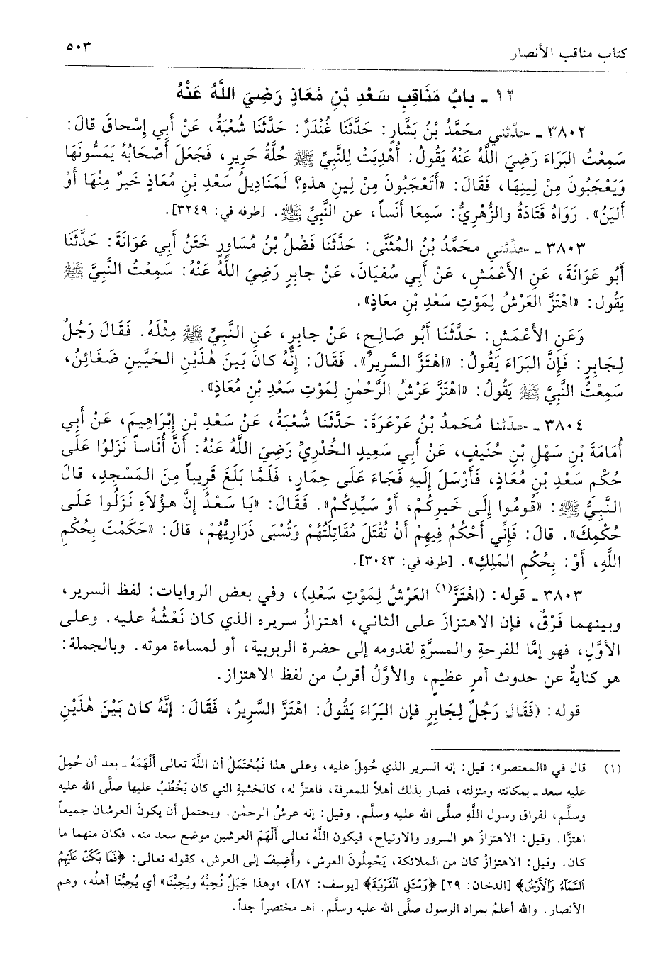 3803 - حَدَّثَنِى مُحَمَّدُ بْنُ الْمُثَنَّى حَدَّثَنَا فَضْلُ بْنُ مُسَاوِرٍ خَتَنُ أَبِى عَوَانَةَ حَدَّثَنَا أَبُو عَوَانَةَ عَنِ الأَعْمَشِ عَنْ أَبِى سُفْيَانَ عَنْ جَابِرٍ - رضى الله عنه - سَمِعْتُ النَّبِىَّ - صلى الله عليه وسلم - يَقُولُ «اهْتَزَّ الْعَرْشُ لِمَوْتِ سَعْدِ بْنِ مُعَاذٍ».
