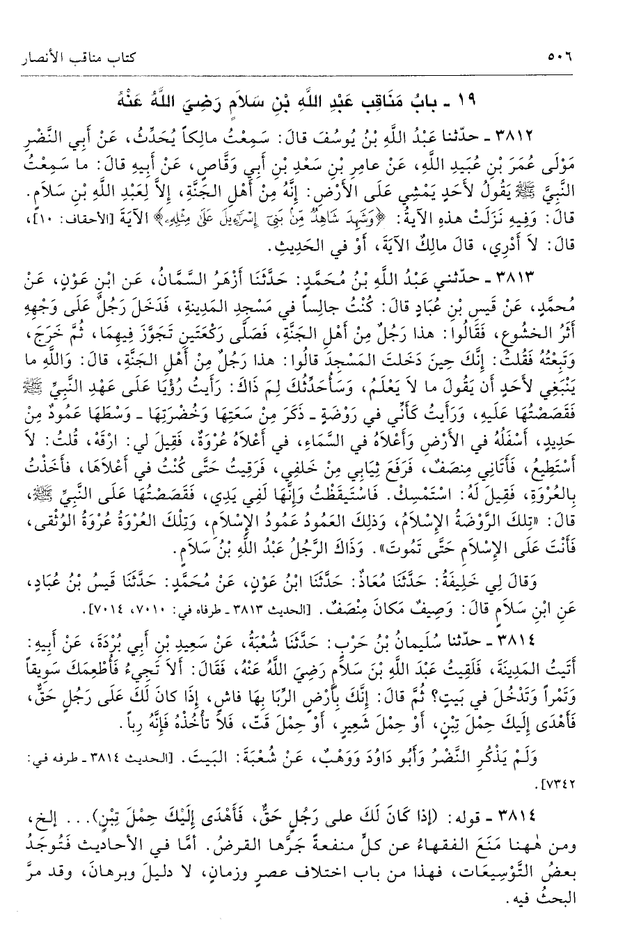 3813 - حَدَّثَنِى عَبْدُ اللَّهِ بْنُ مُحَمَّدٍ حَدَّثَنَا أَزْهَرُ السَّمَّانُ عَنِ ابْنِ عَوْنٍ عَنْ مُحَمَّدٍ عَنْ قَيْسِ بْنِ عُبَادٍ قَالَ كُنْتُ جَالِسًا فِى مَسْجِدِ الْمَدِينَةِ، فَدَخَلَ رَجُلٌ عَلَى وَجْهِهِ أَثَرُ الْخُشُوعِ، فَقَالُوا هَذَا رَجُلٌ مِنْ أَهْلِ الْجَنَّةِ. فَصَلَّى رَكْعَتَيْنِ تَجَوَّزَ فِيهِمَا ثُمَّ خَرَجَ، وَتَبِعْتُهُ فَقُلْتُ إِنَّكَ حِينَ دَخَلْتَ الْمَسْجِدَ قَالُوا هَذَا رَجُلٌ مِنْ أَهْلِ الْجَنَّةِ. قَالَ وَاللَّهِ مَا يَنْبَغِى لأَحَدٍ أَنْ يَقُولَ مَا لاَ يَعْلَمُ وَسَأُحَدِّثُكَ لِمَ ذَاكَ رَأَيْتُ رُؤْيَا عَلَى عَهْدِ النَّبِىِّ - صلى الله عليه وسلم - فَقَصَصْتُهَا عَلَيْهِ، وَرَأَيْتُ كَأَنِّى فِى رَوْضَةٍ - ذَكَرَ مِنْ سَعَتِهَا وَخُضْرَتِهَا - وَسْطَهَا عَمُودٌ مِنْ حَدِيدٍ، أَسْفَلُهُ فِى الأَرْضِ وَأَعْلاَهُ فِى السَّمَاءِ، فِى أَعْلاَهُ عُرْوَةٌ فَقِيلَ لَهُ ارْقَهْ. قُلْتُ لاَ أَسْتَطِيعُ. فَأَتَانِى مِنْصَفٌ فَرَفَعَ ثِيَابِى مِنْ خَلْفِى، فَرَقِيتُ حَتَّى كُنْتُ فِى أَعْلاَهَا، فَأَخَذْتُ بِالْعُرْوَةِ، فَقِيلَ لَهُ اسْتَمْسِكْ. فَاسْتَيْقَظْتُ وَإِنَّهَا لَفِى يَدِى، فَقَصَصْتُهَا عَلَى النَّبِىِّ - صلى الله عليه وسلم - قَالَ «تِلْكَ الرَّوْضَةُ الإِسْلاَمُ، وَذَلِكَ الْعَمُودُ عَمُودُ الإِسْلاَمِ، وَتِلْكَ الْعُرْوَةُ عُرْوَةُ الْوُثْقَى، فَأَنْتَ عَلَى الإِسْلاَمِ حَتَّى تَمُوتَ». وَذَاكَ الرَّجُلُ عَبْدُ اللَّهِ بْنُ سَلاَمٍ. طرفاه 7010، 7014 - تحفة 5332 - 47/ 5