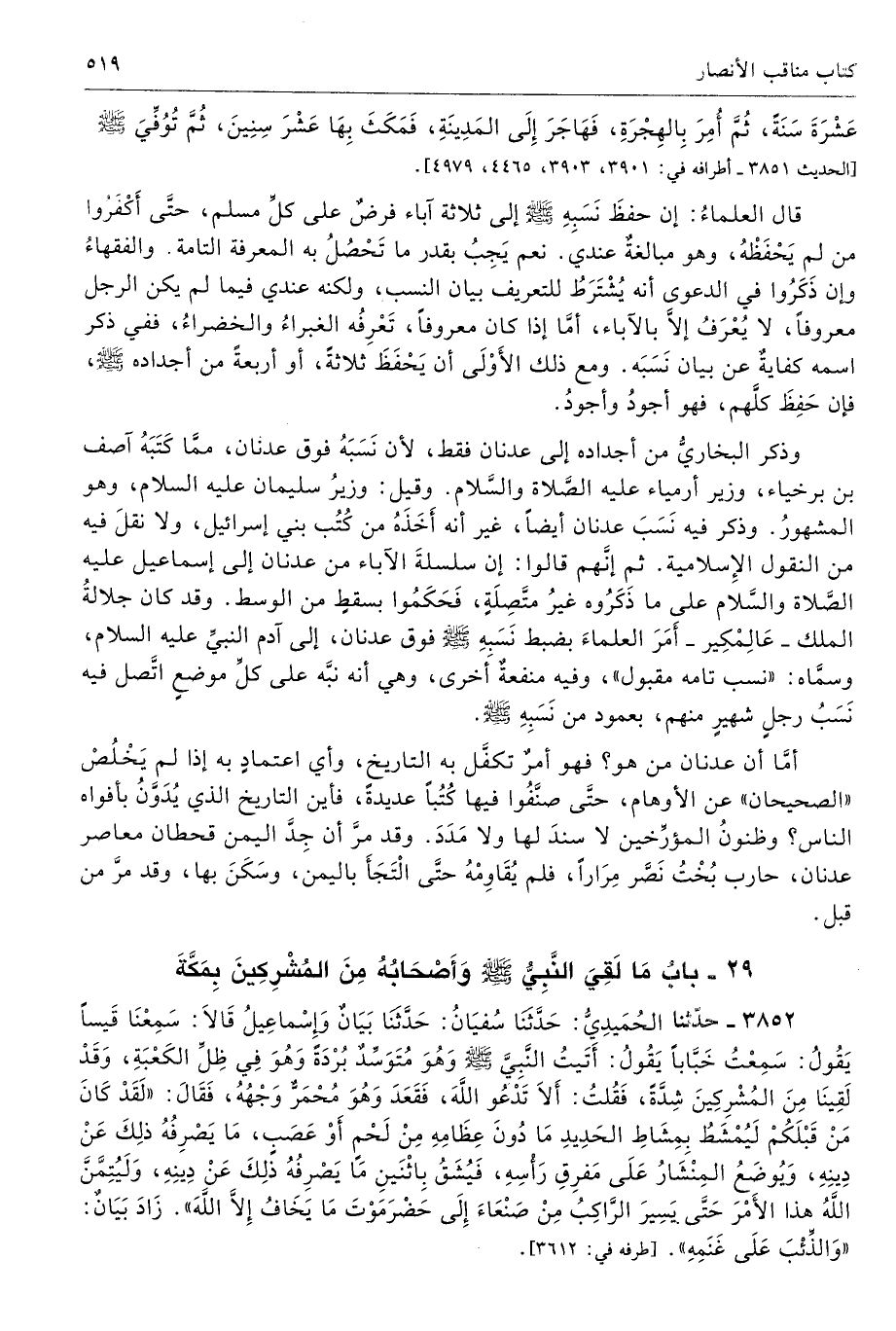 وذكر البخاريُّ من أجداده إلى عدنان فقط، لأن نَسَبَهُ فوق عدنان، ممَّا كَتَبَهُ آصف بن برخياء، وزير أرمياء عليه الصَّلاة والسَّلام. وقيل: وزيرُ سليمان عليه السلام، وهو المشهورُ. وذكر فيه نَسَبَ عدنان أيضًا، غير أنه أَخَذَهُ من كُتُب بني إسرائيل، ولا نقلَ فيه من النقول الإِسلامية. ثم إنَّهم قالوا: إن سلسلةَ الآباء من عندنا إلى إسماعيل عليه الصَّلاة والسَّلام على ما ذَكَرُوه غيرُ متَّصِلَةٍ، فَحَكَمُوا بسقطٍ من الوسط. وقد كان جلالةُ الملك - عَالِمْكِير - أَمَرَ العلماءَ بضبط نَسَبِهِ صلى الله عليه وسلّم فوق عدنان، إلى آدم النبيِّ عليه السلام، وسمَّاه: «نسب تامه مقبول»، وفيه منفعةٌ أخرى، وهي أنه نبَّه على كلِّ موضعٍ اتَّصل فيه نَسَبُ رجلٍ شهسرٍ منهم، بعمود من نَسَبِهِ صلى الله عليه وسلّم