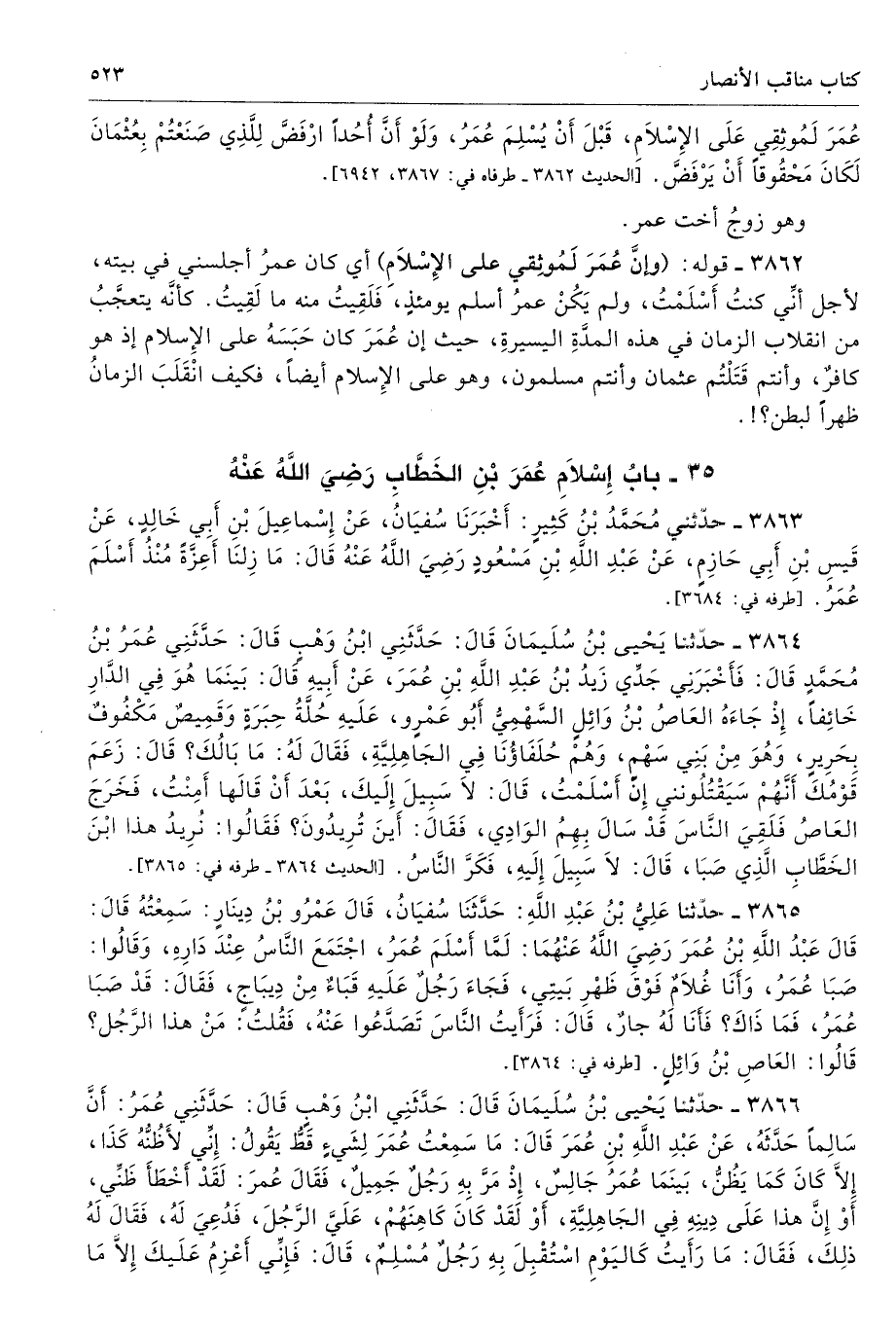 3863 - حَدَّثَنِى مُحَمَّدُ بْنُ كَثِيرٍ أَخْبَرَنَا سُفْيَانُ عَنْ إِسْمَاعِيلَ بْنِ أَبِى خَالِدٍ عَنْ قَيْسِ بْنِ أَبِى حَازِمٍ عَنْ عَبْدِ اللَّهِ بْنِ مَسْعُودٍ - رضى الله عنه - قَالَ مَا زِلْنَا أَعِزَّةً مُنْذُ أَسْلَمَ عُمَرُ. طرفه 3684 - تحفة 9539