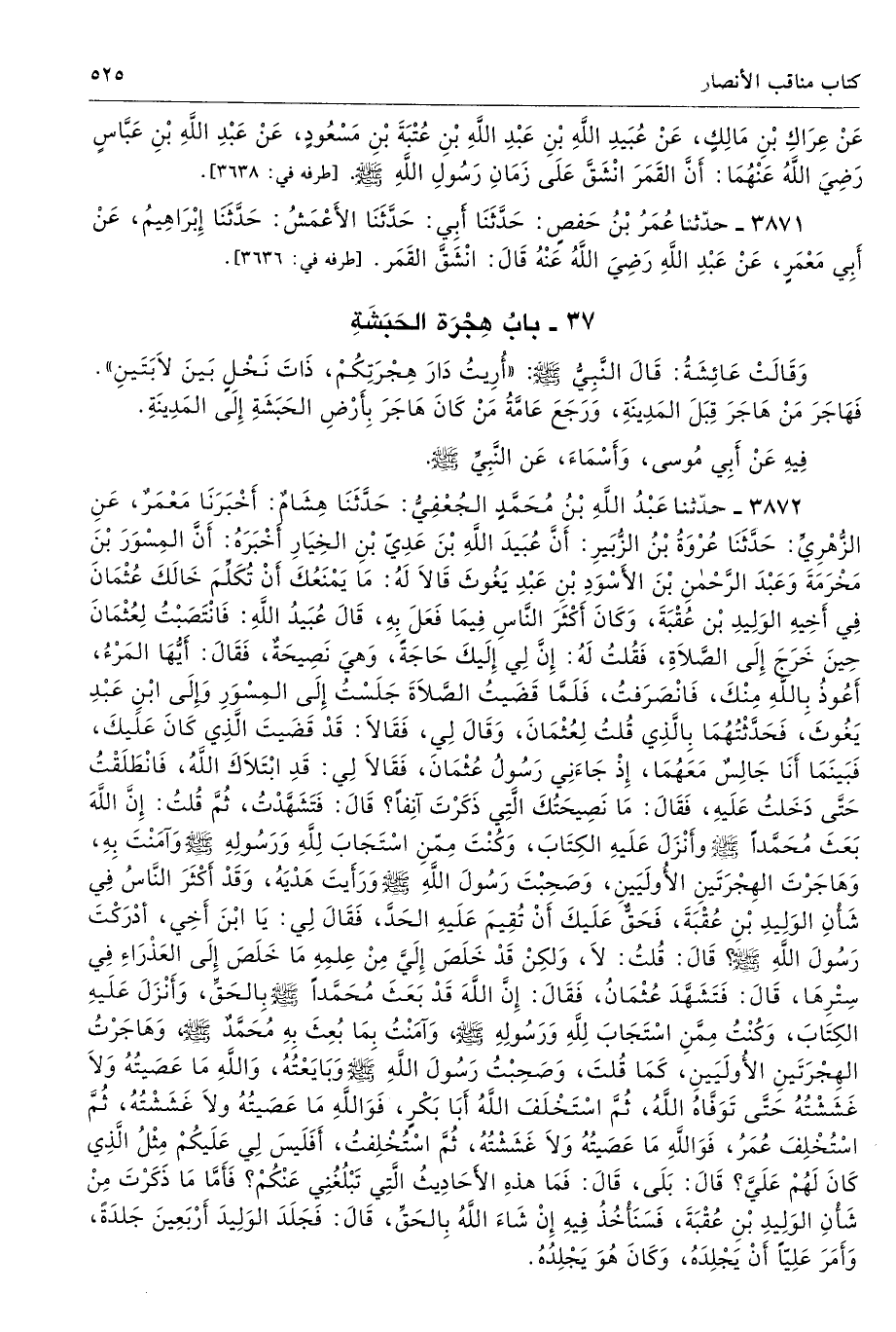3871 - حَدَّثَنَا عُمَرُ بْنُ حَفْصٍ حَدَّثَنَا أَبِى حَدَّثَنَا الأَعْمَشُ حَدَّثَنَا إِبْرَاهِيمُ عَنْ أَبِى مَعْمَرٍ عَنْ عَبْدِ اللَّهِ - رضى الله عنه - قَالَ انْشَقَّ الْقَمَرُ. أطرافه 3636، 3869، 4864، 4865 - تحفة 9336