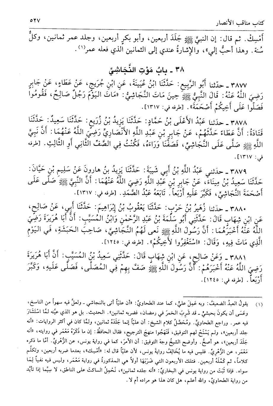 3879 - حَدَّثَنِى عَبْدُ اللَّهِ بْنُ أَبِى شَيْبَةَ حَدَّثَنَا يَزِيدُ عَنْ سَلِيمِ بْنِ حَيَّانَ حَدَّثَنَا سَعِيدُ بْنُ مِينَاءَ عَنْ جَابِرِ بْنِ عَبْدِ اللَّهِ - رضى الله عنهما أَنَّ النَّبِىَّ - صلى الله عليه وسلم - صَلَّى عَلَى أَصْحَمَةَ النَّجَاشِىِّ، فَكَبَّرَ عَلَيْهِ أَرْبَعًا. تَابَعَهُ عَبْدُ الصَّمَدِ. أطرافه 1317، 1320، 1334، 3877، 3878 - تحفة 2262