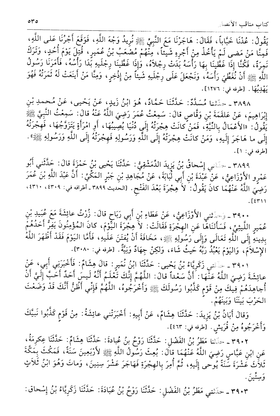 3898 - حَدَّثَنَا مُسَدَّدٌ حَدَّثَنَا حَمَّادٌ - هُوَ ابْنُ زَيْدٍ - عَنْ يَحْيَى عَنْ مُحَمَّدِ بْنِ إِبْرَاهِيمَ عَنْ عَلْقَمَةَ بْنِ وَقَّاصٍ قَالَ سَمِعْتُ عُمَرَ - رضى الله عنه - قَالَ سَمِعْتُ النَّبِىَّ - صلى الله عليه وسلم - يَقُولُ «الأَعْمَالُ بِالنِّيَّةِ، فَمَنْ كَانَتْ هِجْرَتُهُ إِلَى دُنْيَا يُصِيبُهَا أَوِ امْرَأَةٍ يَتَزَوَّجُهَا، فَهِجْرَتُهُ إِلَى مَا هَاجَرَ إِلَيْهِ، وَمَنْ كَانَتْ هِجْرَتُهُ إِلَى اللَّهِ وَرَسُولِهِ، فَهِجْرَتُهُ إِلَى اللَّهِ وَرَسُولِهِ - صلى الله عليه وسلم -». أطرافه 1، 54، 2529، 5070، 6689، 6953 - تحفة 10612