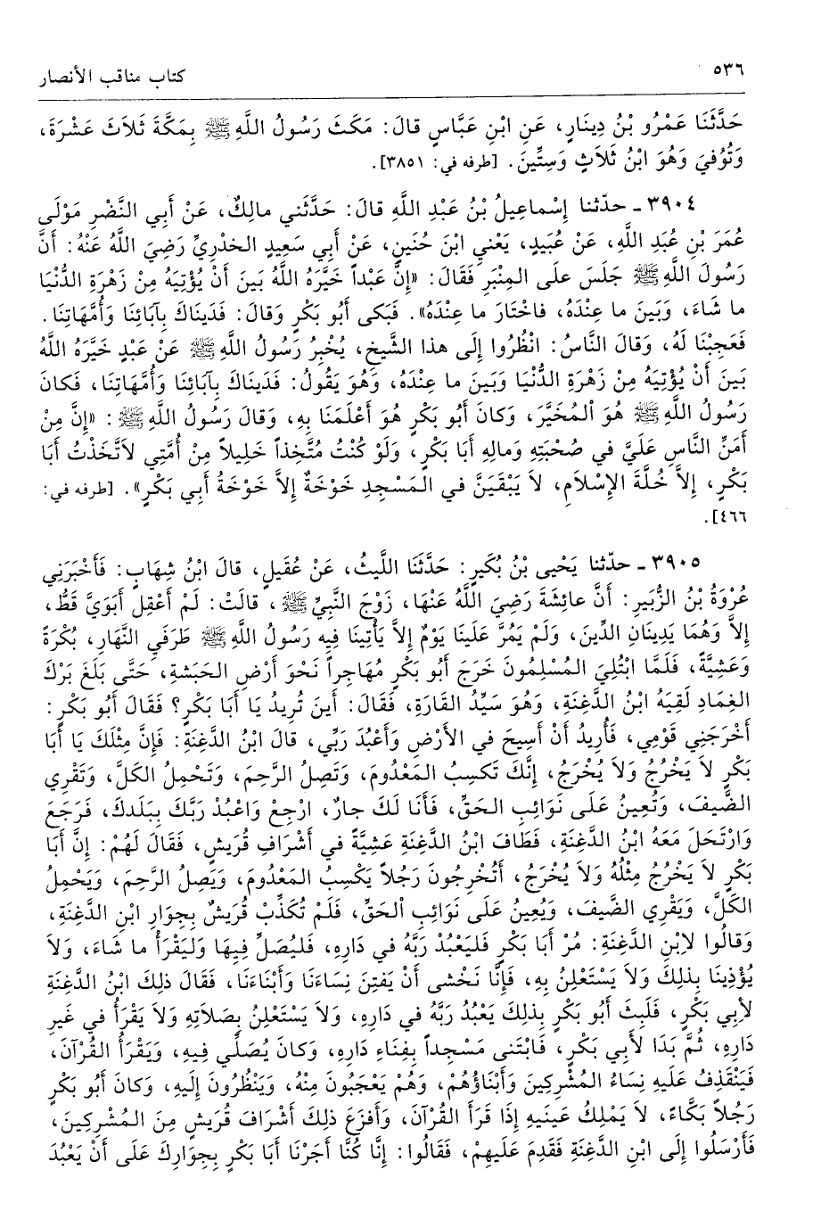 3905 - حَدَّثَنَا يَحْيَى بْنُ بُكَيْرٍ حَدَّثَنَا اللَّيْثُ عَنْ عُقَيْلٍ قَالَ ابْنُ شِهَابٍ فَأَخْبَرَنِى عُرْوَةُ بْنُ الزُّبَيْرِ أَنَّ عَائِشَةَ - رضى الله عنها - زَوْجَ النَّبِىِّ - صلى الله عليه وسلم - قَالَتْ لَمْ أَعْقِلْ أَبَوَىَّ قَطُّ إِلاَّ وَهُمَا يَدِينَانِ الدِّينَ، وَلَمْ يَمُرَّ عَلَيْنَا يَوْمٌ إِلاَّ يَأْتِينَا فِيهِ رَسُولُ اللَّهِ - صلى الله عليه وسلم - طَرَفَىِ النَّهَارِ بُكْرَةً وَعَشِيَّةً، فَلَمَّا ابْتُلِىَ الْمُسْلِمُونُ خَرَجَ أَبُو بَكْرٍ مُهَاجِرًا نَحْوَ أَرْضِ الْحَبَشَةِ، حَتَّى بَلَغَ بَرْكَ الْغِمَادِ لَقِيَهُ ابْنُ الدَّغِنَةِ وَهْوَ سَيِّدُ الْقَارَةِ. فَقَالَ أَيْنَ تُرِيدُ يَا أَبَا بَكْرٍ فَقَالَ أَبُو بَكْرٍ أَخْرَجَنِى قَوْمِى، فَأُرِيدُ أَنْ أَسِيحَ فِى الأَرْضِ وَأَعْبُدَ رَبِّى. قَالَ ابْنُ الدَّغِنَةِ فَإِنَّ مِثْلَكَ يَا أَبَا بَكْرٍ لاَ يَخْرُجُ وَلاَ يُخْرَجُ، إِنَّكَ تَكْسِبُ الْمَعْدُومَ، وَتَصِلُ الرَّحِمَ وَتَحْمِلُ الْكَلَّ، وَتَقْرِى الضَّيْفَ، وَتُعِينُ عَلَى نَوَائِبِ الْحَقِّ، فَأَنَا لَكَ جَارٌ، ارْجِعْ وَاعْبُدْ رَبَّكَ بِبَلَدِكَ. فَرَجَعَ وَارْتَحَلَ مَعَهُ ابْنُ الدَّغِنَةِ، فَطَافَ ابْنُ الدَّغِنَةِ عَشِيَّةً فِى أَشْرَافِ قُرَيْشٍ، فَقَالَ لَهُمْ إِنَّ أَبَا بَكْرٍ لاَ يَخْرُجُ مِثْلُهُ وَلاَ يُخْرَجُ، أَتُخْرِجُونَ رَجُلاً يَكْسِبُ الْمَعْدُومَ، وَيَصِلُ الرَّحِمَ، وَيَحْمِلُ الْكَلَّ، وَيَقْرِى الضَّيْفَ، وَيُعِينُ عَلَى نَوَائِبِ الْحَقِّ فَلَمْ تُكَذِّبْ قُرَيْشٌ بِجِوَارِ ابْنِ الدَّغِنَةِ، وَقَالُوا لاِبْنِ الدَّغِنَةِ مُرْ أَبَا بَكْرٍ فَلْيَعْبُدْ رَبَّهُ فِى دَارِهِ، فَلْيُصَلِّ فِيهَا وَلْيَقْرَأْ مَا شَاءَ، وَلاَ يُؤْذِينَا بِذَلِكَ، وَلاَ يَسْتَعْلِنْ بِهِ، فَإِنَّا نَخْشَى أَنْ يَفْتِنَ نِسَاءَنَا وَأَبْنَاءَنَا. فَقَالَ ذَلِكَ ابْنُ الدَّغِنَةِ لأَبِى بَكْرٍ، فَلَبِثَ أَبُو بَكْرٍ بِذَلِكَ يَعْبُدُ رَبَّهُ فِى دَارِهِ، وَلاَ يَسْتَعْلِنُ بِصَلاَتِهِ، وَلاَ يَقْرَأُ فِى غَيْرِ دَارِهِ، ثُمَّ بَدَا لأَبِى بَكْرٍ فَابْتَنَى مَسْجِدًا بِفِنَاءِ دَارِهِ وَكَانَ يُصَلِّى فِيهِ وَيَقْرَأُ الْقُرْآنَ، فَيَنْقَذِفُ عَلَيْهِ نِسَاءُ الْمُشْرِكِينَ وَأَبْنَاؤُهُمْ، وَهُمْ يَعْجَبُونَ مِنْهُ، وَيَنْظُرُونَ إِلَيْهِ، وَكَانَ أَبُو بَكْرٍ رَجُلاً بَكَّاءً، لاَ يَمْلِكُ عَيْنَيْهِ إِذَا قَرَأَ الْقُرْآنَ، وَأَفْزَعَ ذَلِكَ أَشْرَافَ قُرَيْشٍ مِنَ الْمُشْرِكِينَ، فَأَرْسَلُوا إِلَى ابْنِ الدَّغِنَةِ، فَقَدِمَ عَلَيْهِمْ. فَقَالُوا إِنَّا كُنَّا أَجَرْنَا أَبَا بَكْرٍ بِجِوَارِكَ، عَلَى أَنْ يَعْبُدَ