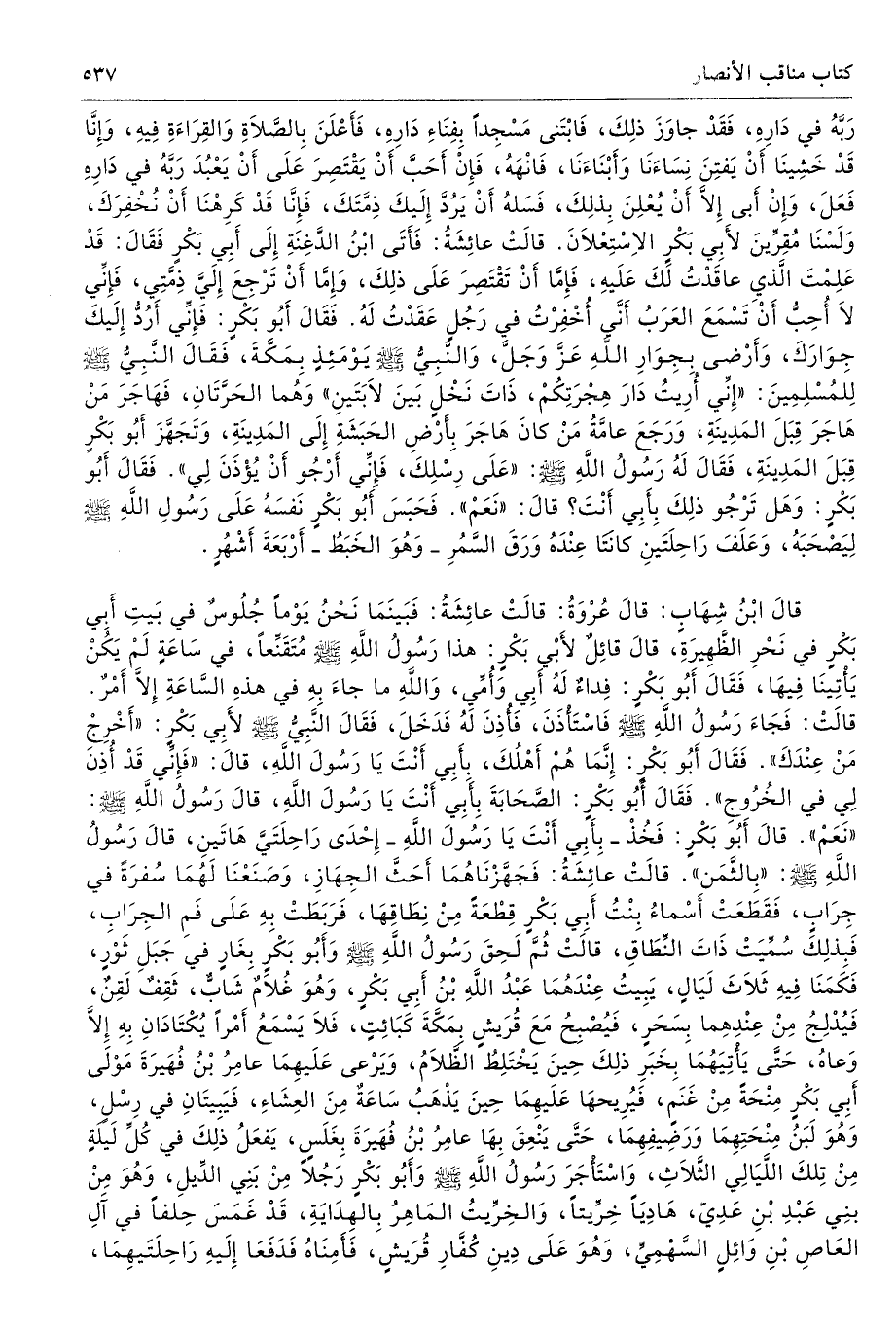 قَالَ ابْنُ شِهَابٍ قَالَ عُرْوَةُ قَالَتْ عَائِشَةُ فَبَيْنَمَا نَحْنُ يَوْمًا جُلُوسٌ فِى بَيْتِ أَبِى بَكْرٍ فِى نَحْرِ الظَّهِيرَةِ قَالَ قَائِلٌ لأَبِى بَكْرٍ هَذَا رَسُولُ اللَّهِ - صلى الله عليه وسلم - مُتَقَنِّعًا - فِى سَاعَةٍ لَمْ يَكُنْ يَأْتِينَا فِيهَا - فَقَالَ أَبُو بَكْرٍ فِدَاءٌ لَهُ أَبِى وَأُمِّى، وَاللَّهِ مَا جَاءَ بِهِ فِى هَذِهِ السَّاعَةِ إِلاَّ أَمْرٌ. قَالَتْ فَجَاءَ رَسُولُ اللَّهِ - صلى الله عليه وسلم - فَاسْتَأْذَنَ، فَأُذِنَ لَهُ فَدَخَلَ، فَقَالَ النَّبِىُّ - صلى الله عليه وسلم - لأَبِى بَكْرٍ «أَخْرِجْ مَنْ عِنْدَكَ». فَقَالَ أَبُو بَكْرٍ إِنَّمَا هُمْ أَهْلُكَ بِأَبِى أَنْتَ يَا رَسُولَ اللَّهِ. قَالَ «فَإِنِّى قَدْ أُذِنَ لِى فِى الْخُرُوجِ». فَقَالَ أَبُو بَكْرٍ الصَّحَابَةُ بِأَبِى أَنْتَ يَا رَسُولَ اللَّهِ. قَالَ رَسُولُ اللَّهِ - صلى الله عليه وسلم - «نَعَمْ». قَالَ أَبُو بَكْرٍ فَخُذْ بِأَبِى أَنْتَ يَا رَسُولَ اللَّهِ إِحْدَى رَاحِلَتَىَّ هَاتَيْنِ. قَالَ رَسُولُ اللَّهِ - صلى الله عليه وسلم - «بِالثَّمَنِ». قَالَتْ عَائِشَةُ فَجَهَّزْنَاهُمَا أَحَثَّ الْجَهَازِ، وَصَنَعْنَا لَهُمَا سُفْرَةً فِى جِرَابٍ، فَقَطَعَتْ أَسْمَاءُ بِنْتُ أَبِى بَكْرٍ قِطْعَةً مَنْ نِطَاقِهَا فَرَبَطَتْ بِهِ عَلَى فَمِ الْجِرَابِ، فَبِذَلِكَ سُمِّيَتْ ذَاتَ النِّطَاقِ - قَالَتْ - ثُمَّ لَحِقَ رَسُولُ اللَّهِ - صلى الله عليه وسلم - وَأَبُو بَكْرٍ بِغَارٍ فِى جَبَلِ ثَوْرٍ فَكَمَنَا فِيهِ ثَلاَثَ لَيَالٍ، يَبِيتُ عِنْدَهُمَا عَبْدُ اللَّهِ بْنُ أَبِى بَكْرٍ وَهْوَ غُلاَمٌ شَابٌّ ثَقِفٌ لَقِنٌ، فَيُدْلِجُ مِنْ عِنْدِهِمَا بِسَحَرٍ، فَيُصْبِحُ مَعَ قُرَيْشٍ بِمَكَّةَ كَبَائِتٍ، فَلاَ يَسْمَعُ أَمْرًا يُكْتَادَانِ بِهِ إِلاَّ وَعَاهُ، حَتَّى يَأْتِيَهُمَا بِخَبَرِ ذَلِكَ حِينَ يَخْتَلِطُ الظَّلاَمُ، وَيَرْعَى عَلَيْهِمَا عَامِرُ بْنُ فُهَيْرَةَ مَوْلَى أَبِى بَكْرٍ مِنْحَةً مِنْ غَنَمٍ، فَيُرِيحُهَا عَلَيْهِمَا حِينَ يَذْهَبُ سَاعَةٌ مِنَ الْعِشَاءِ، فَيَبِيتَانِ فِى رِسْلٍ وَهْوَ لَبَنُ مِنْحَتِهِمَا وَرَضِيفِهِمَا، حَتَّى يَنْعِقَ بِهَا عَامِرُ بْنُ فُهَيْرَةَ بِغَلَسٍ، يَفْعَلُ ذَلِكَ فِى كُلِّ لَيْلَةٍ مِنْ تِلْكَ اللَّيَالِى الثَّلاَثِ، وَاسْتَأْجَرَ رَسُولُ اللَّهِ - صلى الله عليه وسلم - وَأَبُو بَكْرٍ رَجُلاً مِنْ بَنِى الدِّيلِ، وَهْوَ مِنْ بَنِى عَبْدِ بْنِ عَدِىٍّ هَادِيًا خِرِّيتًا - وَالْخِرِّيتُ الْمَاهِرُ بِالْهِدَايَةِ - قَدْ غَمَسَ حِلْفًا فِى آلِ الْعَاصِ بْنِ وَائِلٍ السَّهْمِىِّ، وَهْوَ عَلَى دِينِ كُفَّارِ قُرَيْشٍ فَأَمِنَاهُ، فَدَفَعَا إِلَيْهِ رَاحِلَتَيْهِمَا،