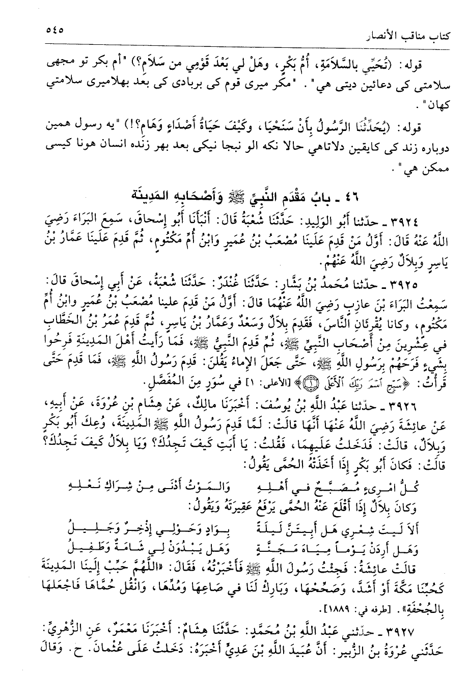 3926 - حَدَّثَنَا عَبْدُ اللَّهِ بْنُ يُوسُفَ أَخْبَرَنَا مَالِكٌ عَنْ هِشَامِ بْنِ عُرْوَةَ عَنْ أَبِيهِ عَنْ عَائِشَةَ - رضى الله عنها - أَنَّهَا قَالَتْ لَمَّا قَدِمَ رَسُولُ اللَّهِ - صلى الله عليه وسلم - الْمَدِينَةَ وُعِكَ أَبُو بَكْرٍ وَبِلاَلٌ - قَالَتْ - فَدَخَلْتُ عَلَيْهِمَا فَقُلْتُ يَا أَبَتِ كَيْفَ تَجِدُكَ وَيَا بِلاَلُ، كَيْفَ تَجِدُكَ قَالَتْ فَكَانَ أَبُو بَكْرٍ إِذَا أَخَذَتْهُ الْحُمَّى يَقُولُ