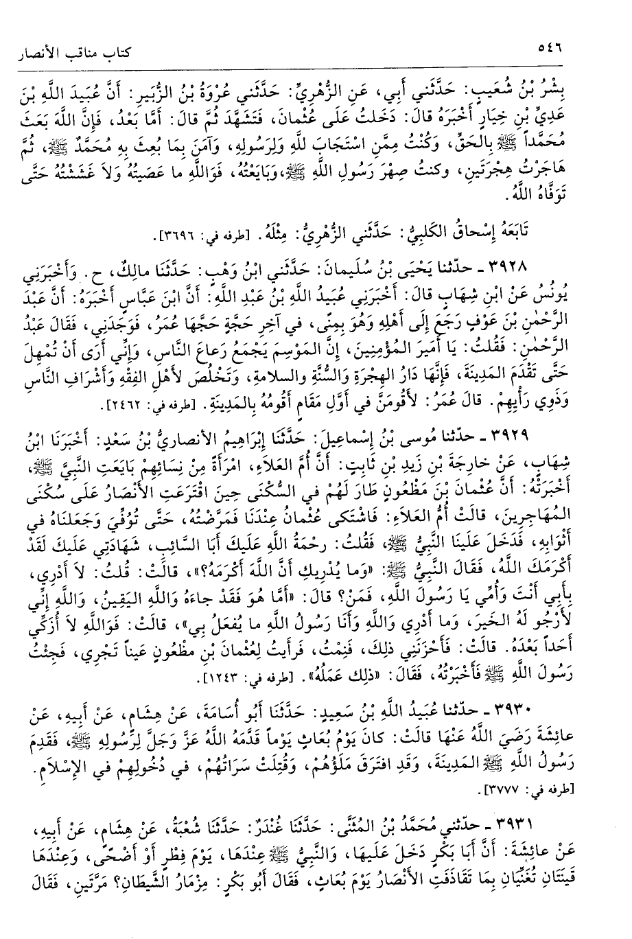 3929 - حَدَّثَنَا مُوسَى بْنُ إِسْمَاعِيلَ حَدَّثَنَا إِبْرَاهِيمُ بْنُ سَعْدٍ أَخْبَرَنَا ابْنُ شِهَابٍ عَنْ خَارِجَةَ بْنِ زَيْدِ بْنِ ثَابِتٍ أَنَّ أُمَّ الْعَلاَءِ - امْرَأَةً مِنْ نِسَائِهِمْ بَايَعَتِ النَّبِىَّ - صلى الله عليه وسلم - أَخْبَرَتْهُ أَنَّ عُثْمَانَ بْنَ مَظْعُونٍ طَارَ لَهُمْ فِى السُّكْنَى حِينَ اقْتَرَعَتِ الأَنْصَارُ عَلَى سُكْنَى الْمُهَاجِرِينَ، قَالَتْ أُمُّ الْعَلاَءِ فَاشْتَكَى عُثْمَانُ عِنْدَنَا، فَمَرَّضْتُهُ حَتَّى تُوُفِّىَ، وَجَعَلْنَاهُ فِى أَثْوَابِهِ، فَدَخَلَ عَلَيْنَا النَّبِىُّ - صلى الله عليه وسلم - فَقُلْتُ رَحْمَةُ اللَّهِ عَلَيْكَ أَبَا السَّائِبِ، شَهَادَتِى عَلَيْكَ لَقَدْ أَكْرَمَكَ اللَّهُ. فَقَالَ النَّبِىُّ - صلى الله عليه وسلم - «وَمَا يُدْرِيكِ أَنَّ اللَّهَ أَكْرَمَهُ». قَالَتْ قُلْتُ لاَ أَدْرِى بِأَبِى أَنْتَ وَأُمِّى يَا رَسُولَ اللَّهِ فَمَنْ قَالَ «أَمَّا هُوَ فَقَدْ جَاءَهُ وَاللَّهِ الْيَقِينُ، وَاللَّهِ إِنِّى لأَرْجُو لَهُ الْخَيْرَ، وَمَا أَدْرِى وَاللَّهِ وَأَنَا رَسُولُ اللَّهِ مَا يُفْعَلُ بِى». قَالَتْ فَوَاللَّهِ لاَ أُزَكِّى أَحَدًا بَعْدَهُ قَالَتْ فَأَحْزَنَنِى ذَلِكَ فَنِمْتُ فَأُرِيتُ لِعُثْمَانَ بْنِ مَظْعُونٍ عَيْنًا تَجْرِى، فَجِئْتُ رَسُولَ اللَّهِ - صلى الله عليه وسلم - فَأَخْبَرْتُهُ. فَقَالَ «ذَلِكَ عَمَلُهُ». أطرافه 1243، 2687، 7003، 7004، 7018 - تحفة 18338 - 86/ 5