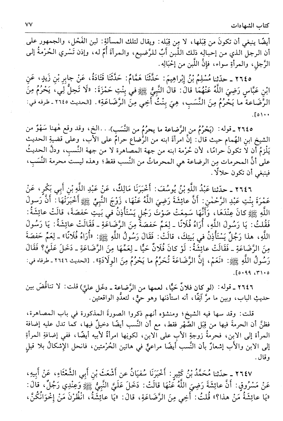 2645 - حَدَّثَنَا مُسْلِمُ بْنُ إِبْرَاهِيمَ حَدَّثَنَا هَمَّامٌ حَدَّثَنَا قَتَادَةُ عَنْ جَابِرِ بْنِ زَيْدٍ عَنِ ابْنِ عَبَّاسٍ - رضى الله عنهما - قَالَ قَالَ النَّبِىُّ - صلى الله عليه وسلم - فِى بِنْتِ حَمْزَةَ «لاَ تَحِلُّ لِى، يَحْرُمُ مِنَ الرَّضَاعِ مَا يَحْرُمُ مِنَ النَّسَبِ، هِىَ بِنْتُ أَخِى مِنَ الرَّضَاعَةِ». طرفه 5100 - تحفة 5378