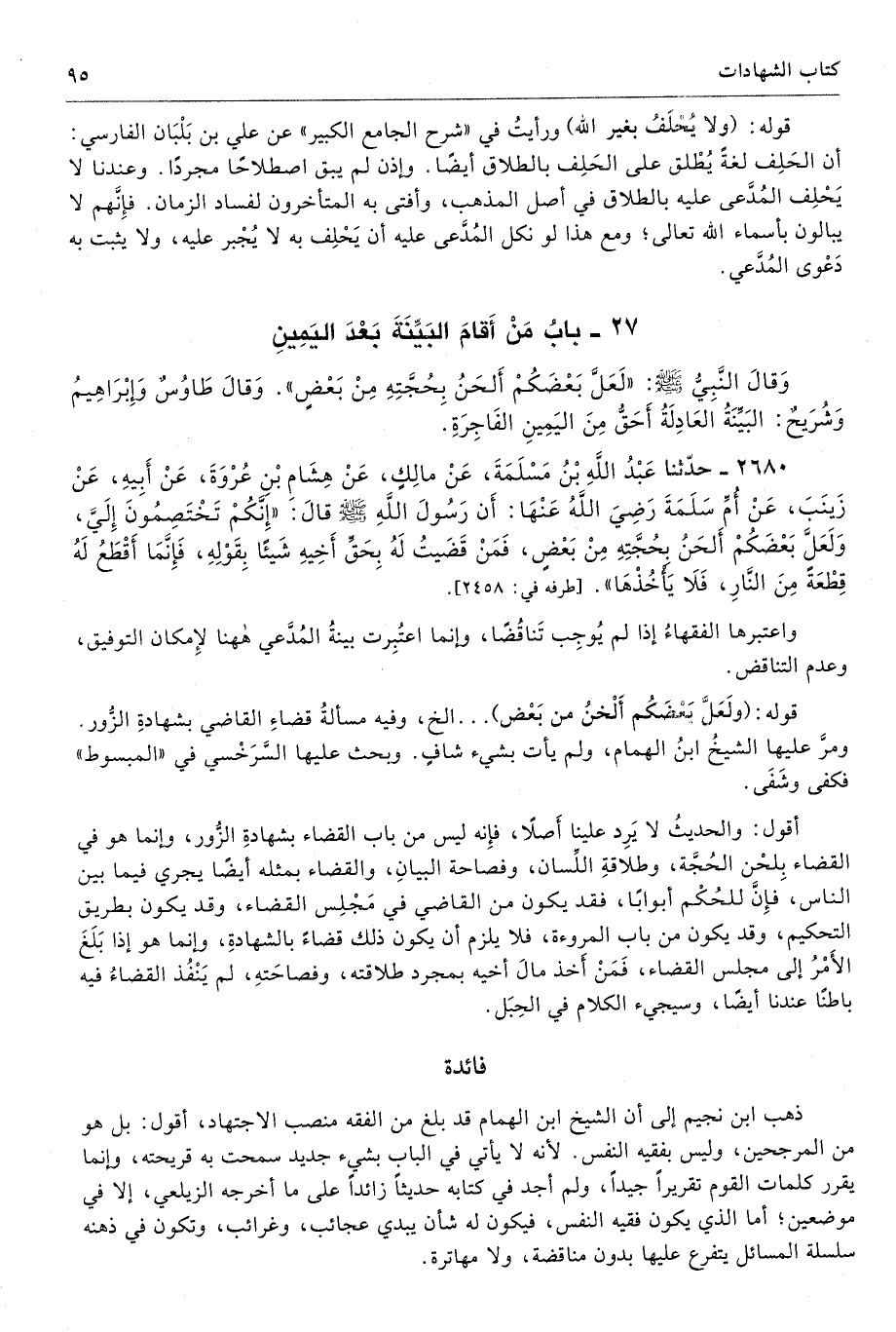 قوله: (ولَعَلَّ بَعْضَكُم أَلْخنُ من بَعْض) ... الخ، وفيه مسألةُ قضاءِ القاضي بشهادةِ الزُّور. ومرَّ عليها الشيخُ ابنُ الهِمام، ولم يأت بشيء شافٍ. وبحث عليها السَّرَخْسي في «المبسوط» فكفى وشَفَى.