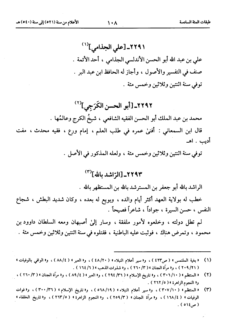 (2) «المنتظم» (10/ 306)، و «تاريخ الإسلام» (36/ 294)، و «العبر» (4/ 89)، و «مرآة الجنان» (3/ 260)، و «النجوم الزاهرة» (5/ 262).