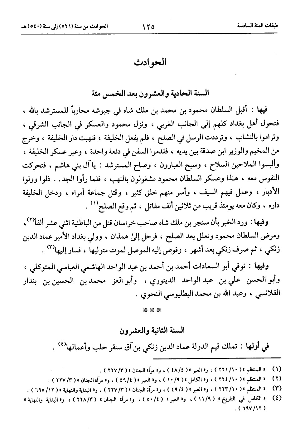 وفيها: ورد الخبر بأن سنجر بن ملك شاه صاحب خراسان قتل من الباطنية اثني عشر ألفا (2)، ومرض السلطان محمود وتعلل بعد الصلح، فرحل إلى همذان، وولي بغداد الأمير عماد الدين زنكي، ثم صرف زنكي بعد أشهر، وفوض إليه الموصل لموت متوليها، فسار إليها (3).