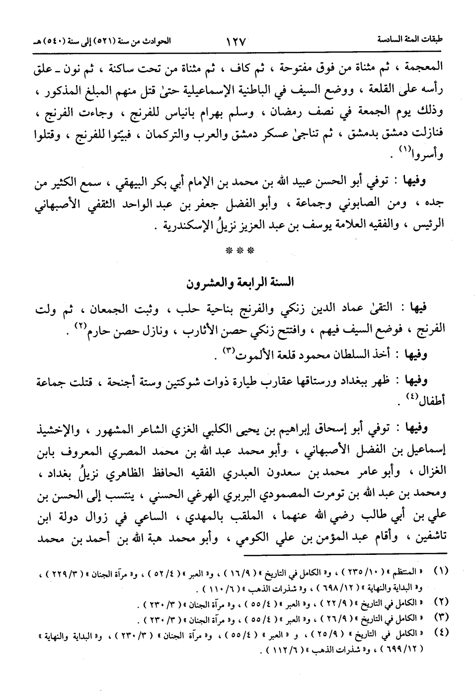 (4) «الكامل في التاريخ» (9/ 25)، و «العبر» (4/ 55)، و «مرآة الجنان» (3/ 230)، و «البداية والنهاية» (12/ 699)، و «شذرات الذهب» (6/ 112).